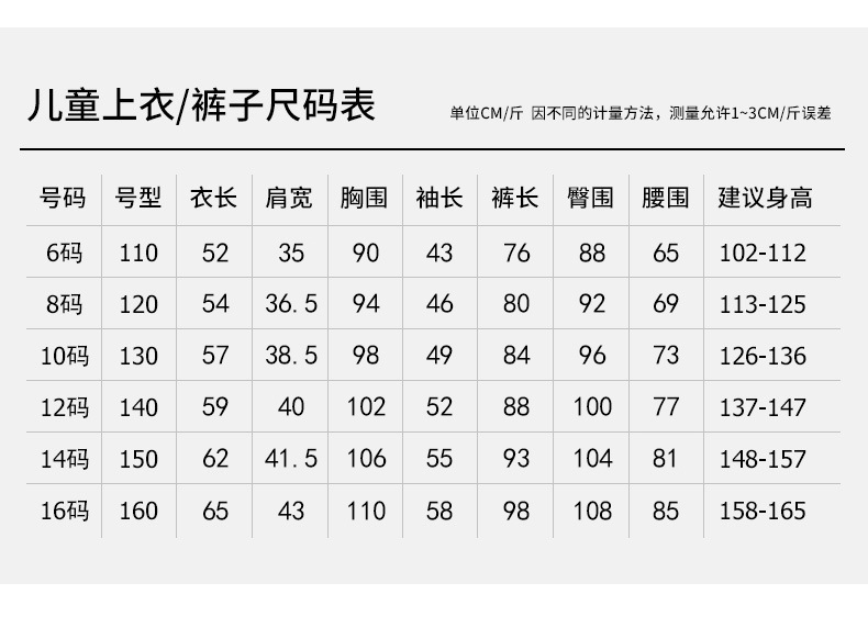 尺码 6码(建议身高101-112 CM),8码(建议身高113-125 CM),10码(建议身高126-136 CM),12码(建议身高137-147 CM),14码(建议身高148-157 CM),16码(建议身高157-165 CM)