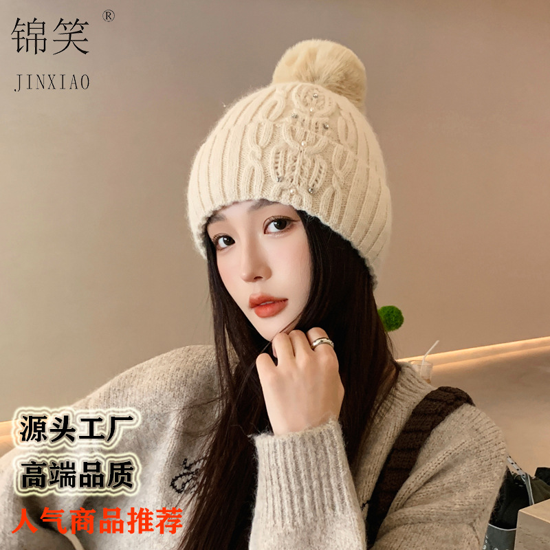 冬季新款防寒保暖毛球针织帽子女生户外防风加绒百搭护耳毛线帽潮