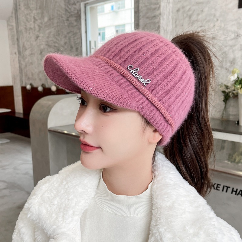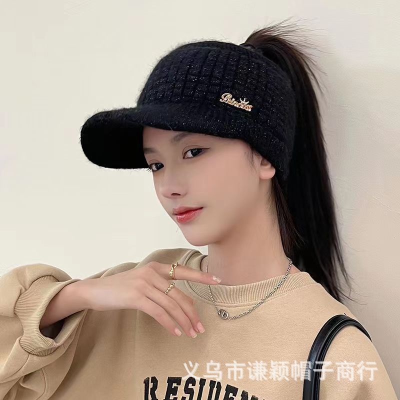 韩版时尚秋冬季毛绒针织空顶帽子高马尾保暖新款加绒加厚鸭舌帽子