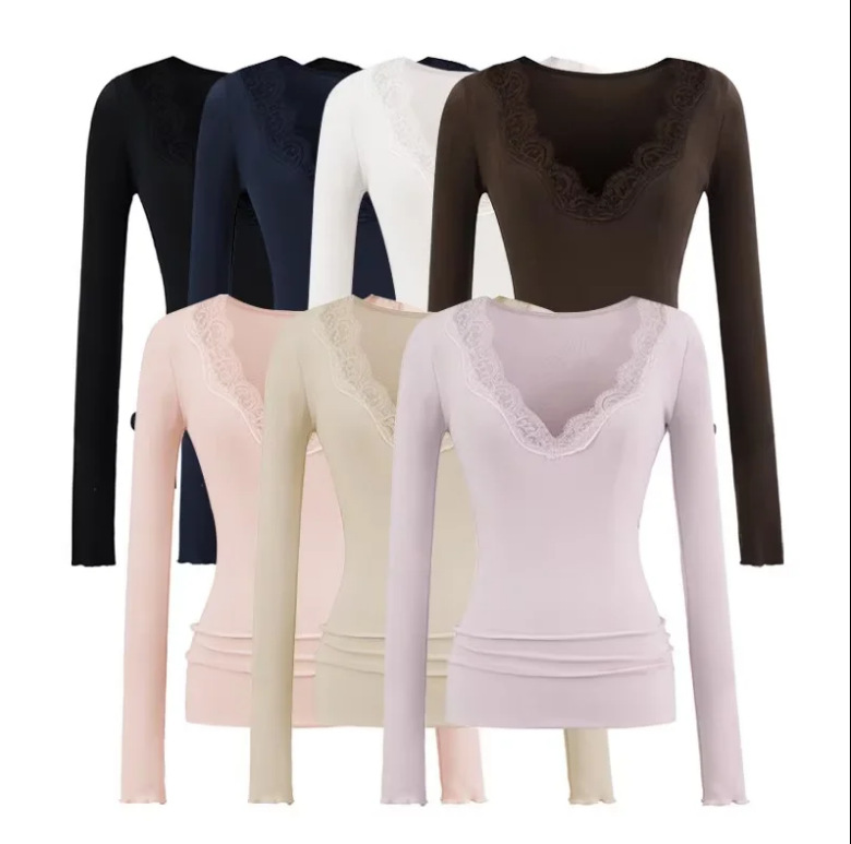 V领蕾丝拼接长袖T桖女2025秋季新款美式辣妹风纯色修身显瘦打底衫
