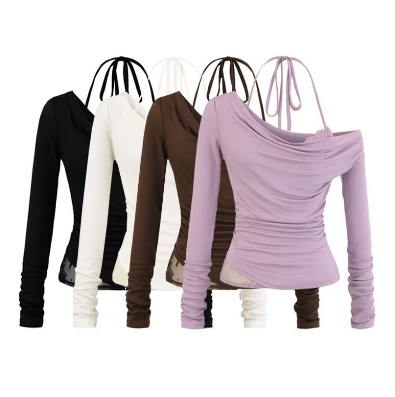 荡领蕾丝假两件长袖T桖女2025秋季新款美式辣妹风纯色挂脖打底衫