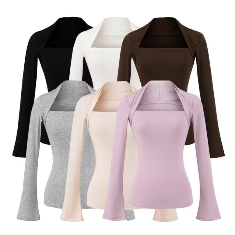 天丝方领假两件长袖T桖女2025秋季新款辣妹风纯色坎肩修身打底衫