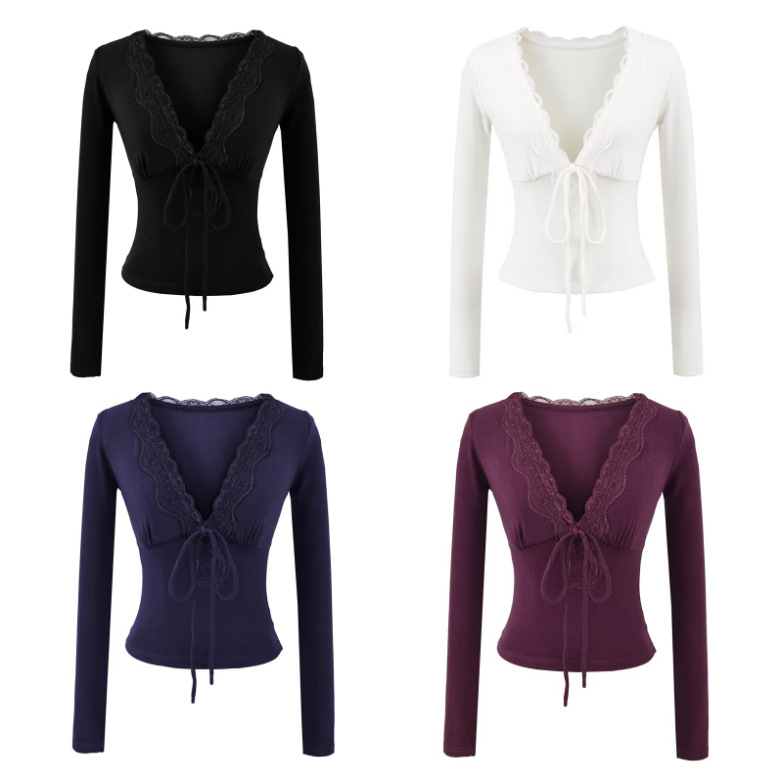V领绷带长袖T桖女2025秋季新款美式纯欲风蕾丝拼接花边打底衫上衣
