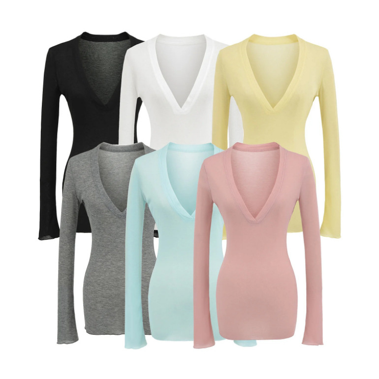 纯色长袖深V领正肩T恤25夏季新款女修身掐腰显瘦内搭打底辣妹上衣