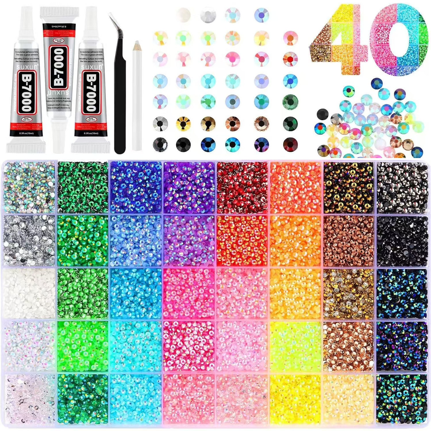 规格 40格32000颗+3只10ml胶水,24格30000颗+3只10ml胶水,28格30000颗+1只10ml胶水,24格24000颗+3只10ml胶水,24格彩色24000颗+3只10ml胶水,24彩色混AB色24000颗+3只10ml胶水