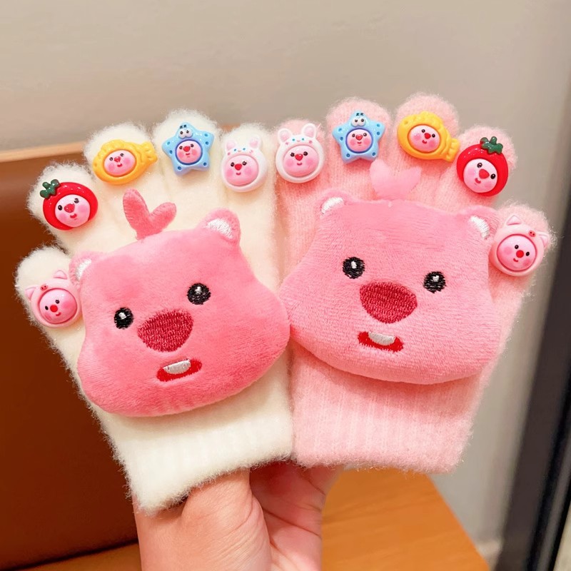 秋冬季儿童手套卡通草莓熊加绒五指套女童可爱个性写字保暖连指套