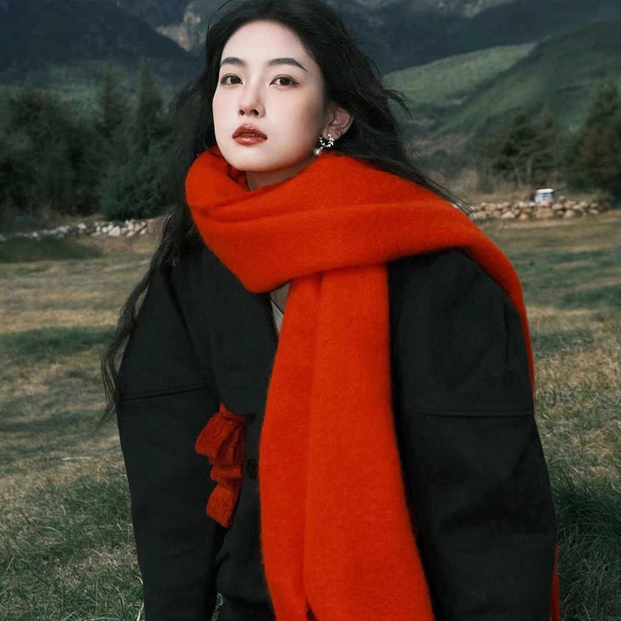 复古红围巾秋冬韩系氛围感女士百搭仿羊毛围巾纯色保暖围脖长披肩