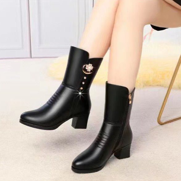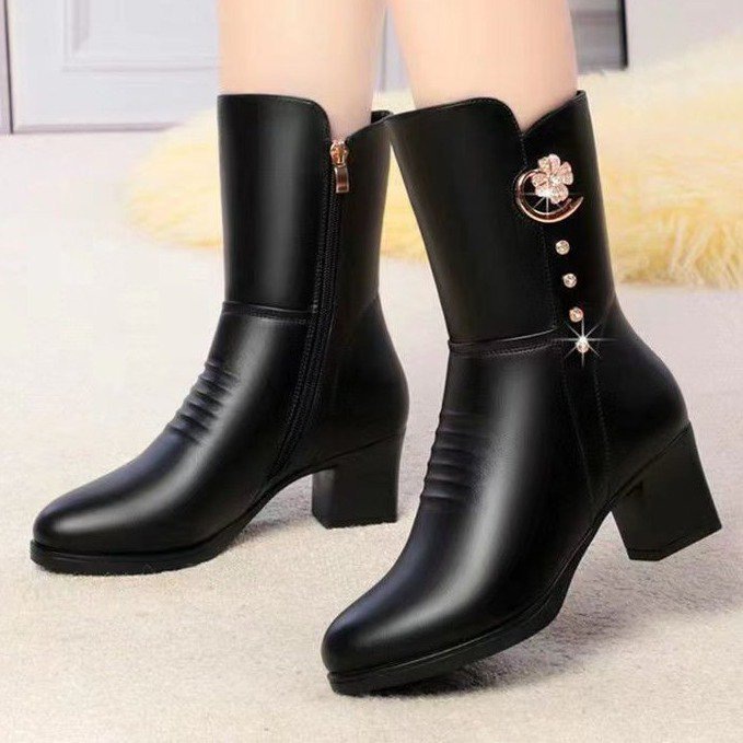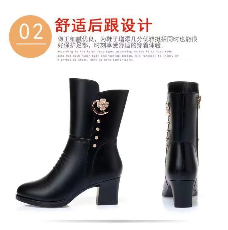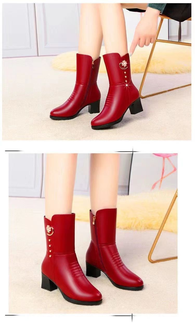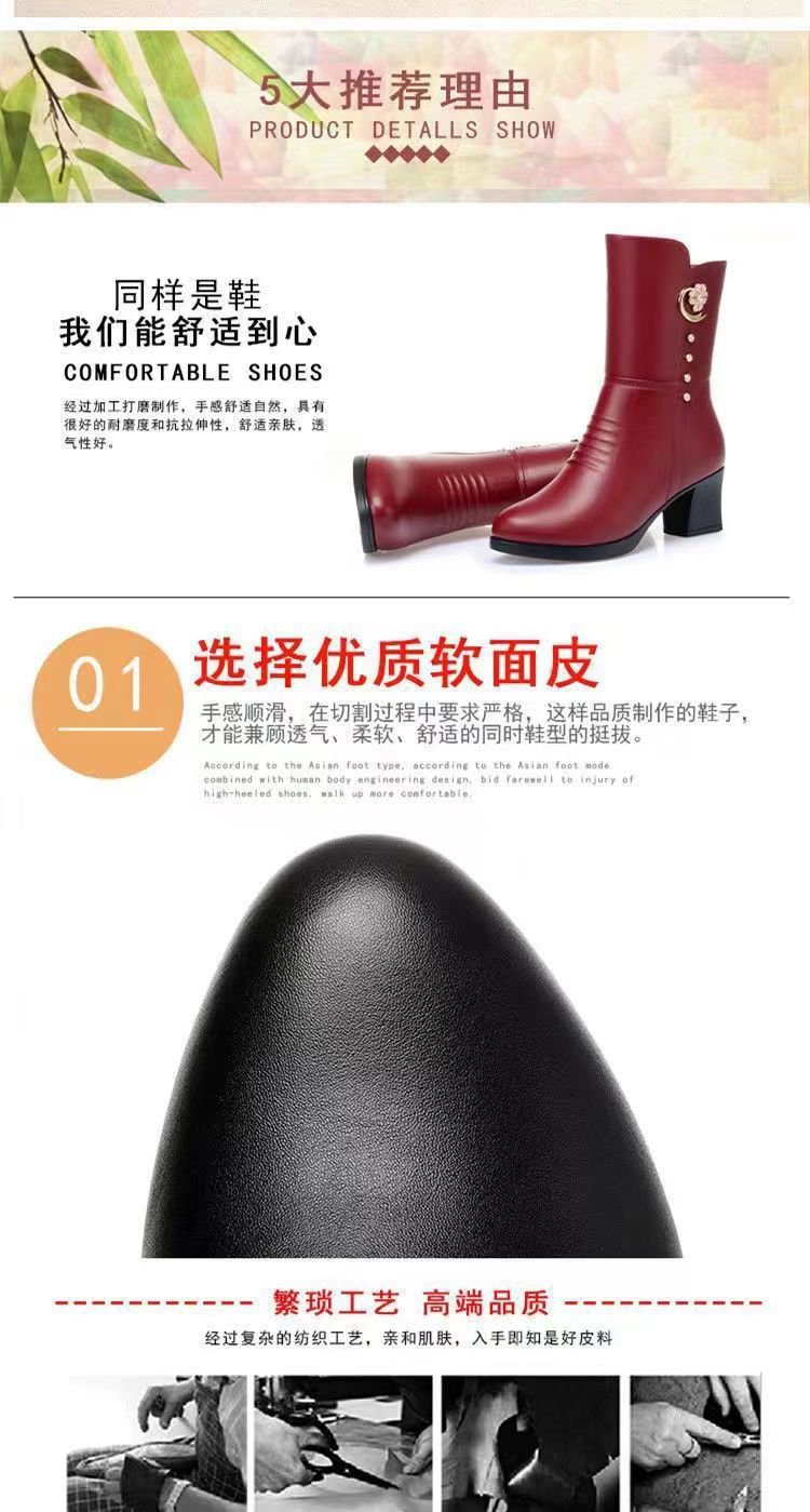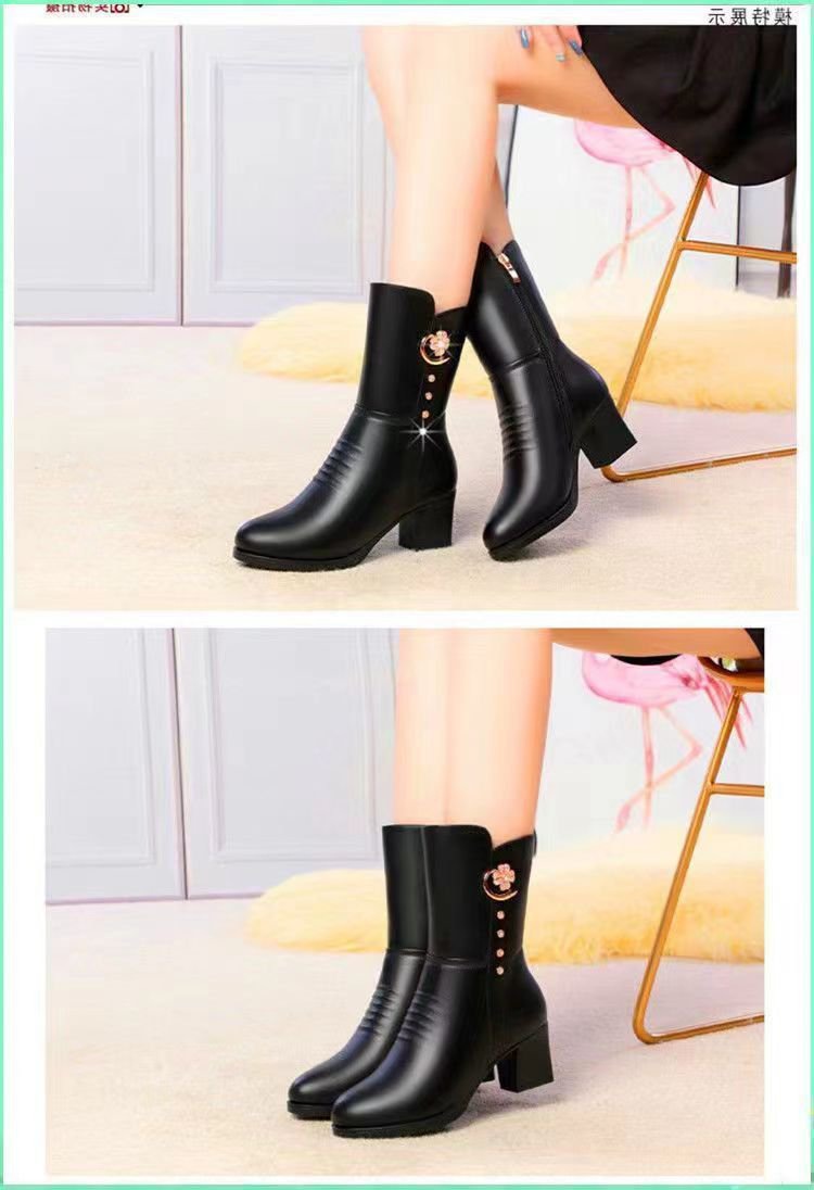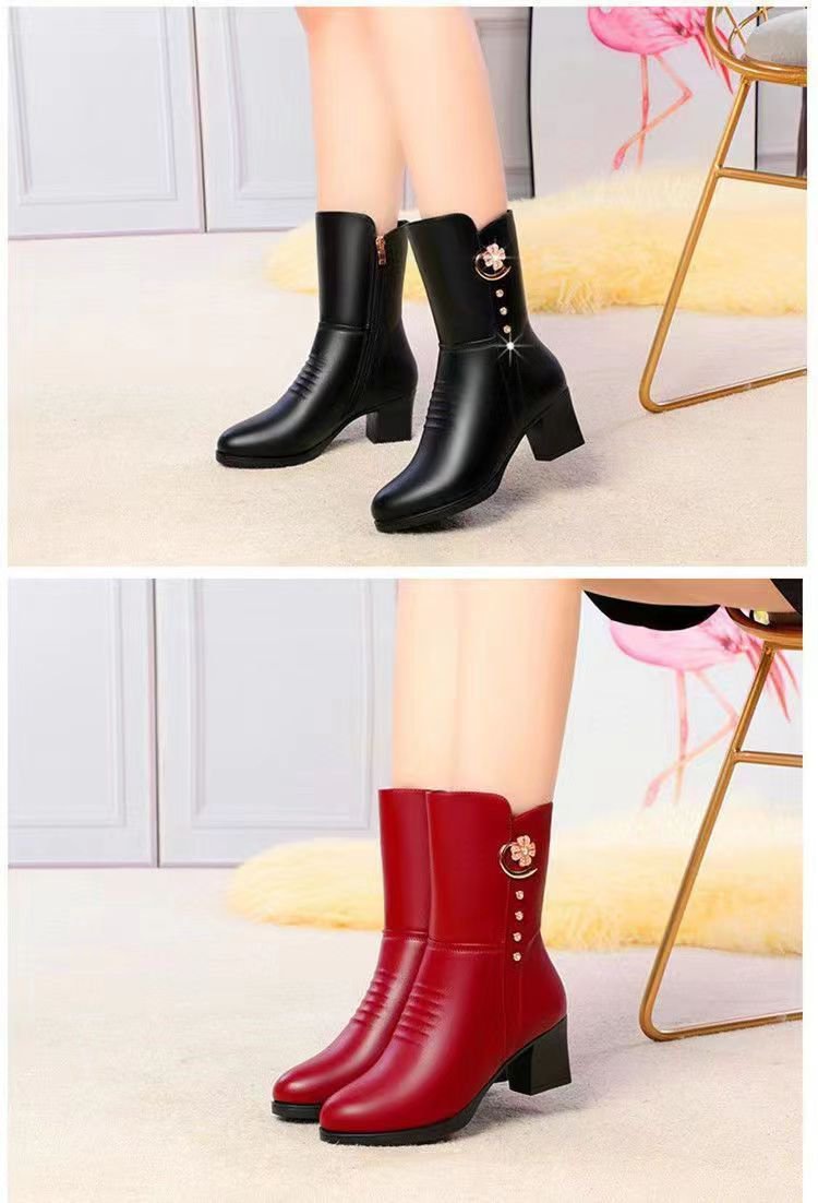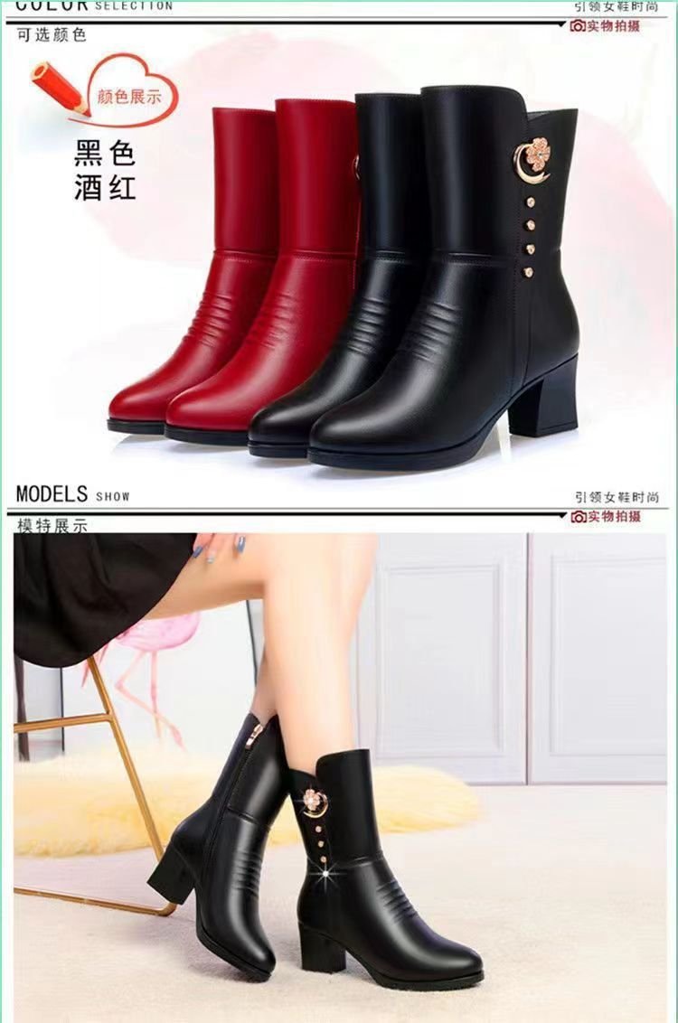 女士棉靴子中筒新款马丁靴高跟鞋女冬季加绒加厚防滑保暖妈妈棉鞋