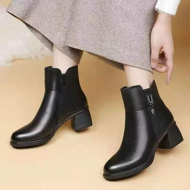 软皮短靴女2025秋冬新款粗跟加绒棉靴中年妇女棉鞋防寒女士马丁靴