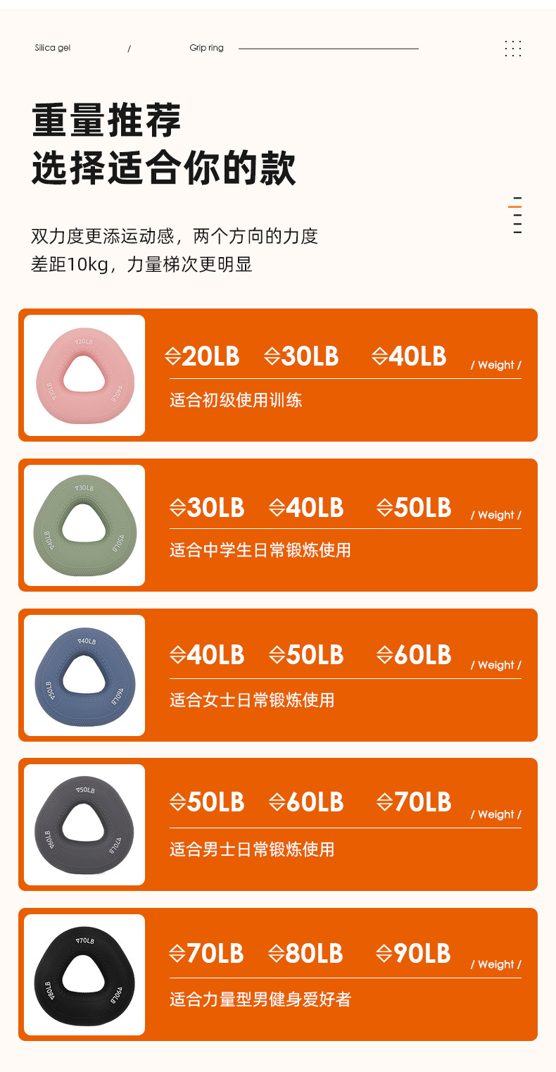 颜色 粉红色20-30-40LB,绿色30-40-50LB,蓝色40-50-60LB,灰色50-60-70LB,黑色70-80-90LB