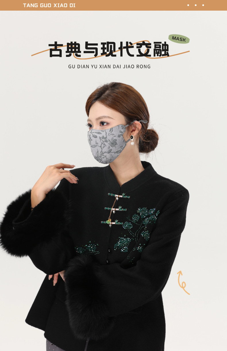 サテン国潮重工マスク秋冬防風保温マスクファッション蝶チューリップ刺繍マスク水洗い可能