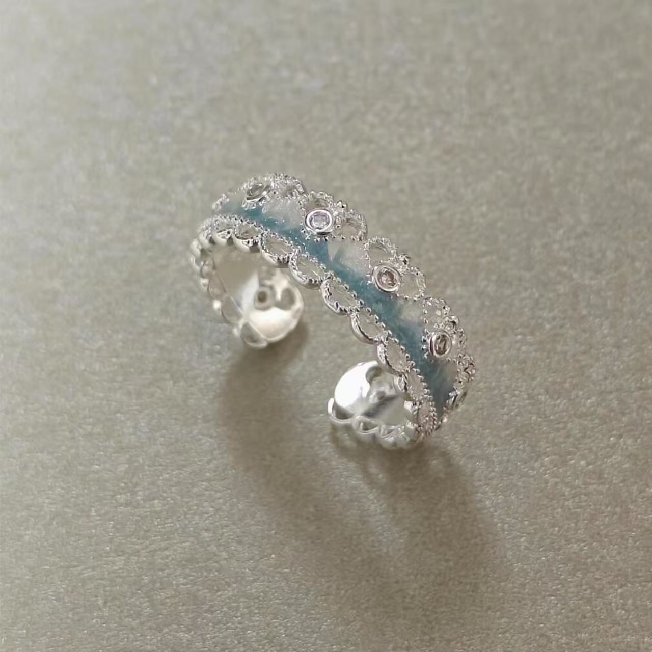 蓝色滴釉蕾丝花边戒指女2025年新款清冷感韩系精致百搭点钻食指戒