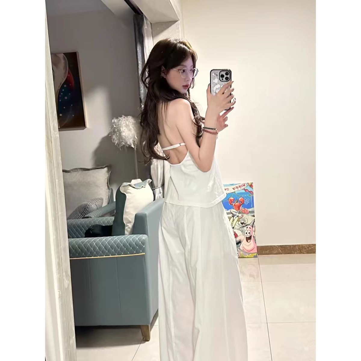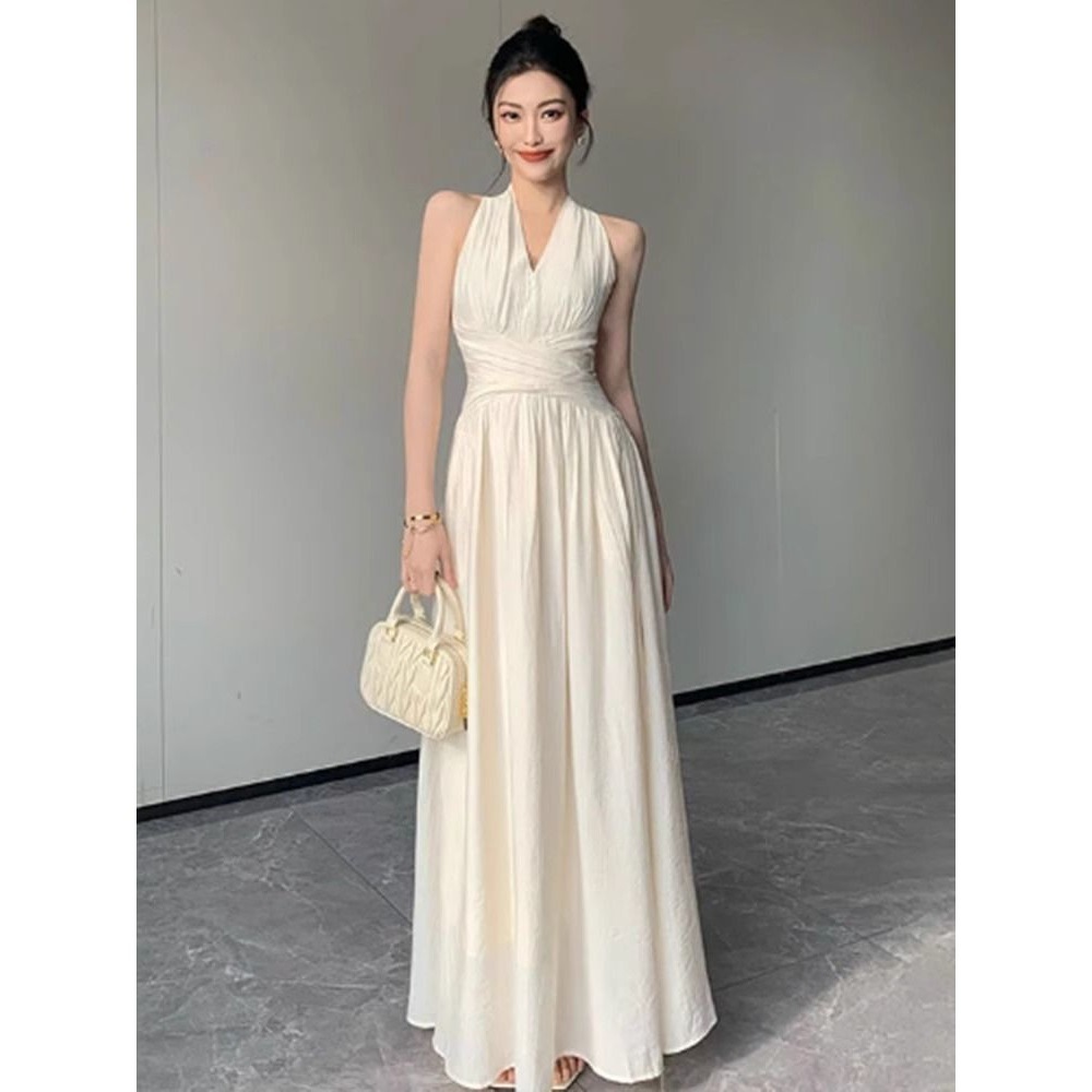 フレンチホワイトノースリーブホルターネックVネックドレス女性用2025新しい夏スタイル美しいウエスト痩身ロングスカート