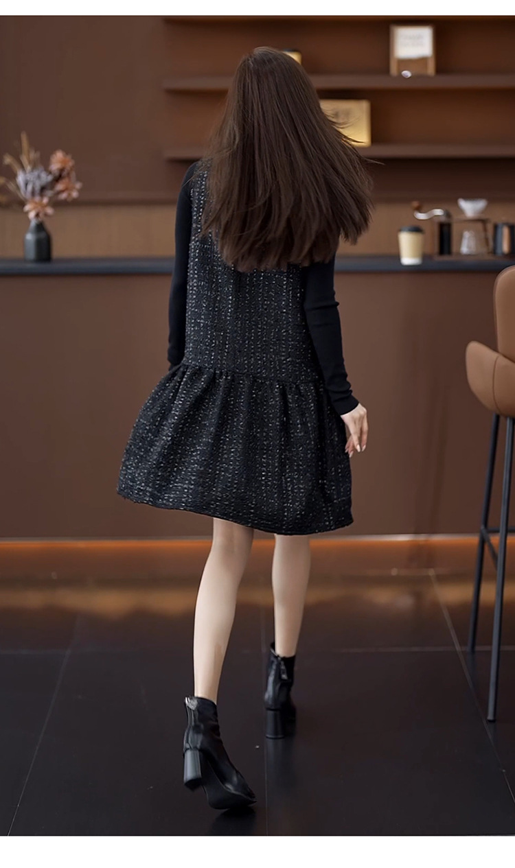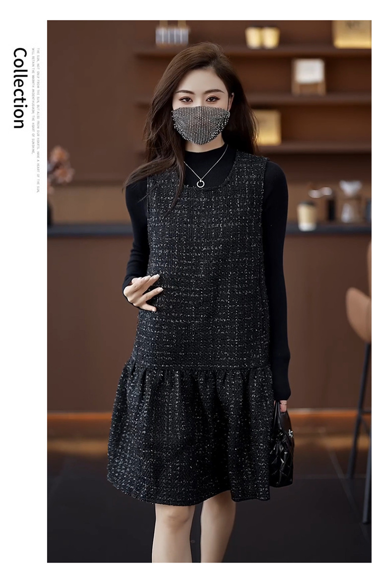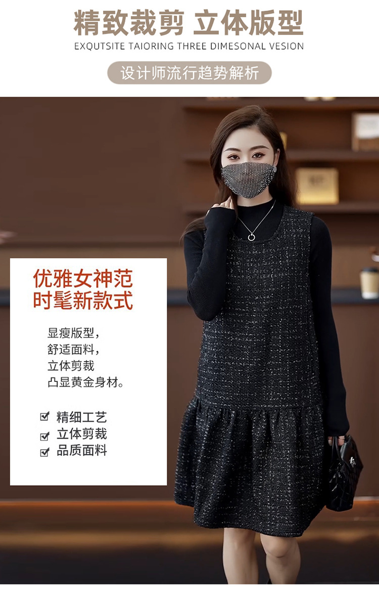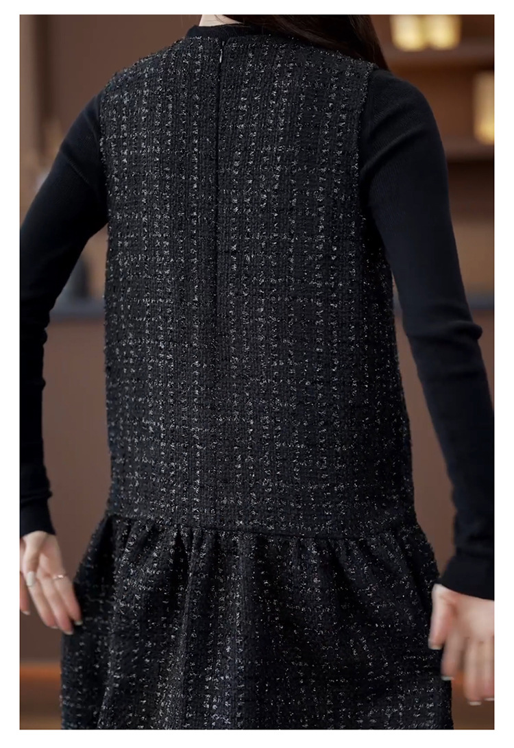 小香風ベストスカートは秋冬のユニークなvネックa字ワンピース2024馬甲のゆるいハスの葉の縁の黒い潮です。