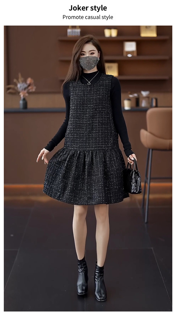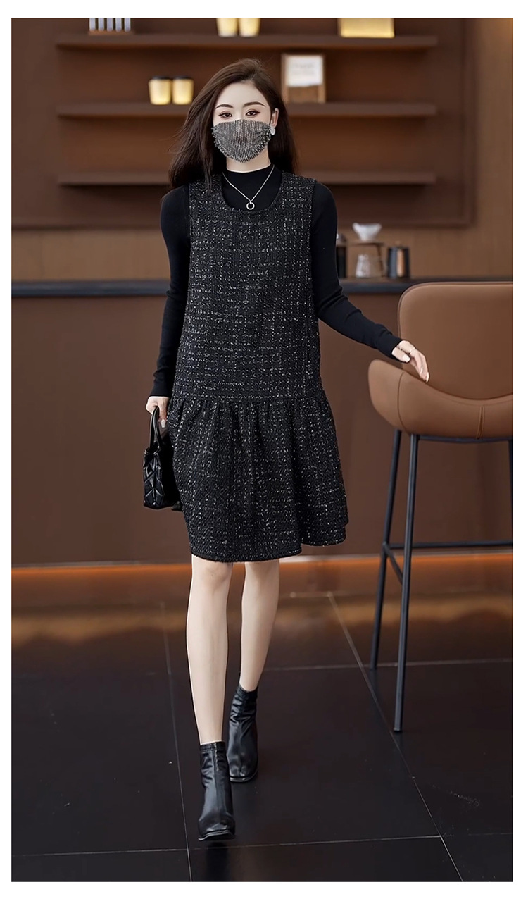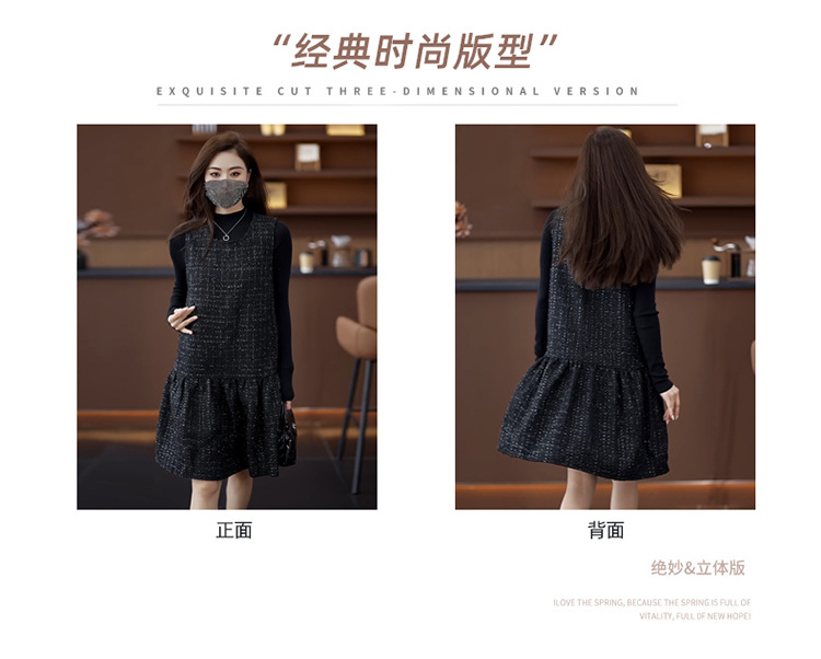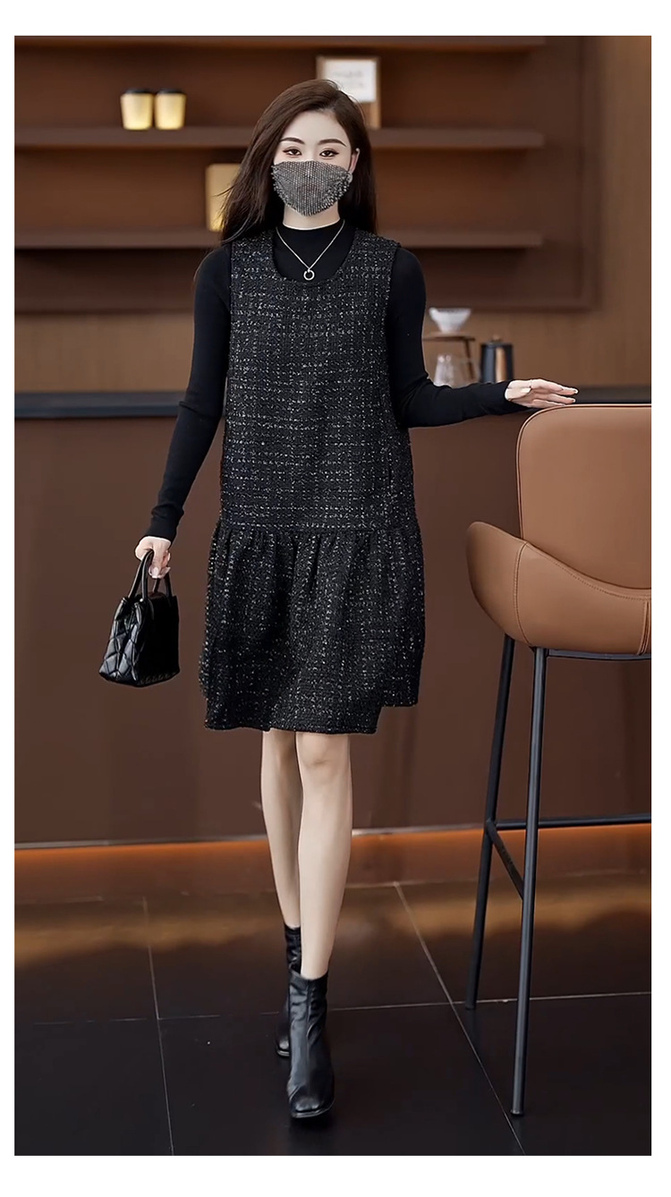 小香風ベストスカートは秋冬のユニークなvネックa字ワンピース2024馬甲のゆるいハスの葉の縁の黒い潮です。