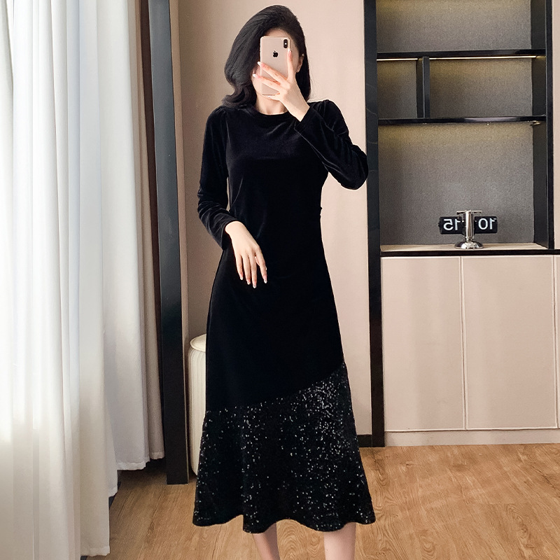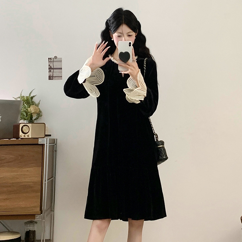 法式复古风感黑色连衣裙女秋季拼接袖口气质宽松显瘦洋气短裙