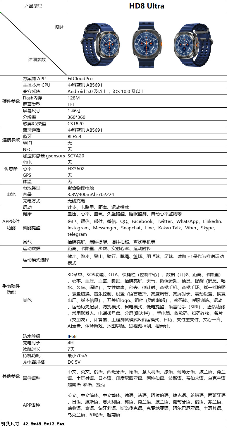 HD8 Ultra智能手表蓝牙通话心率血压睡眠监测信息运动计步手表