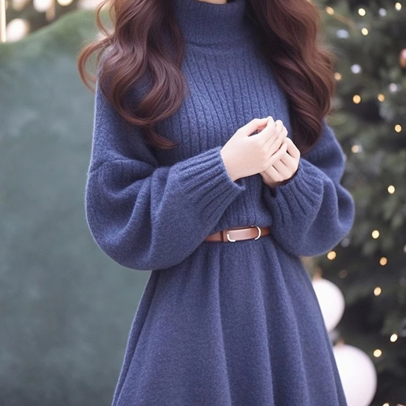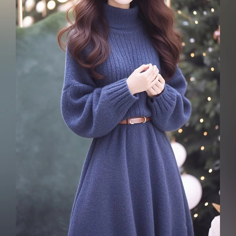 2025冬季新款法式复古收腰显瘦气质休闲藏蓝色针织连衣裙