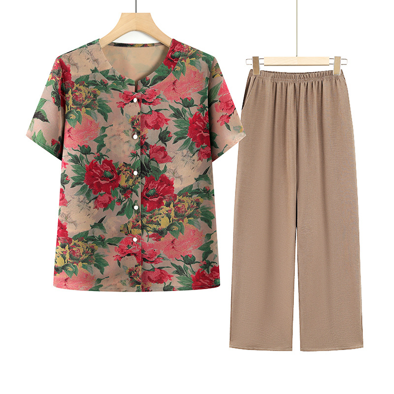 おばあちゃんの夏スーツ 2025 新しい中国風のシャツ母親の半袖服妻高齢者女性ツーピースセット