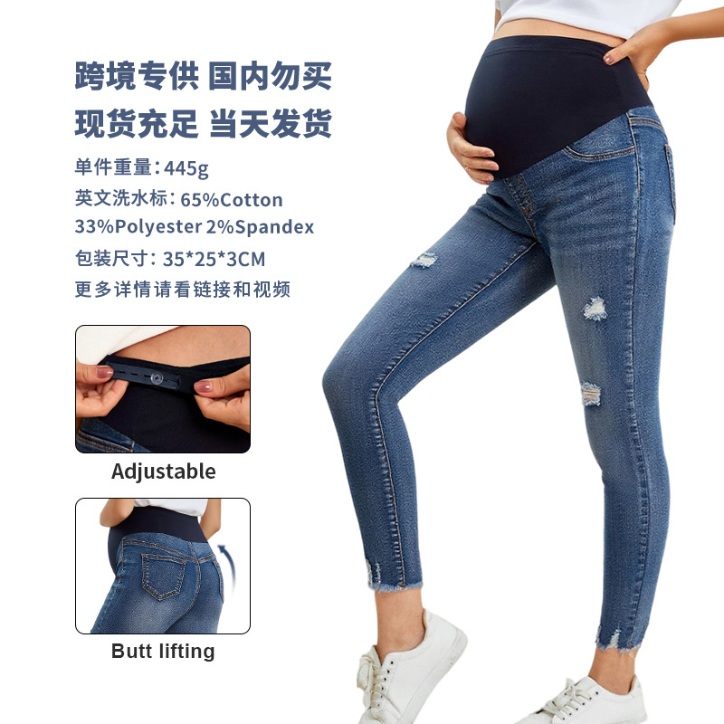 ハイウエストのお腹を支えるダメージ加工のマタニティジーンズ、おしゃれなスキニーフィット、伸縮性のある秋冬用クロスボーダーマタニティジーンズ、外履き用