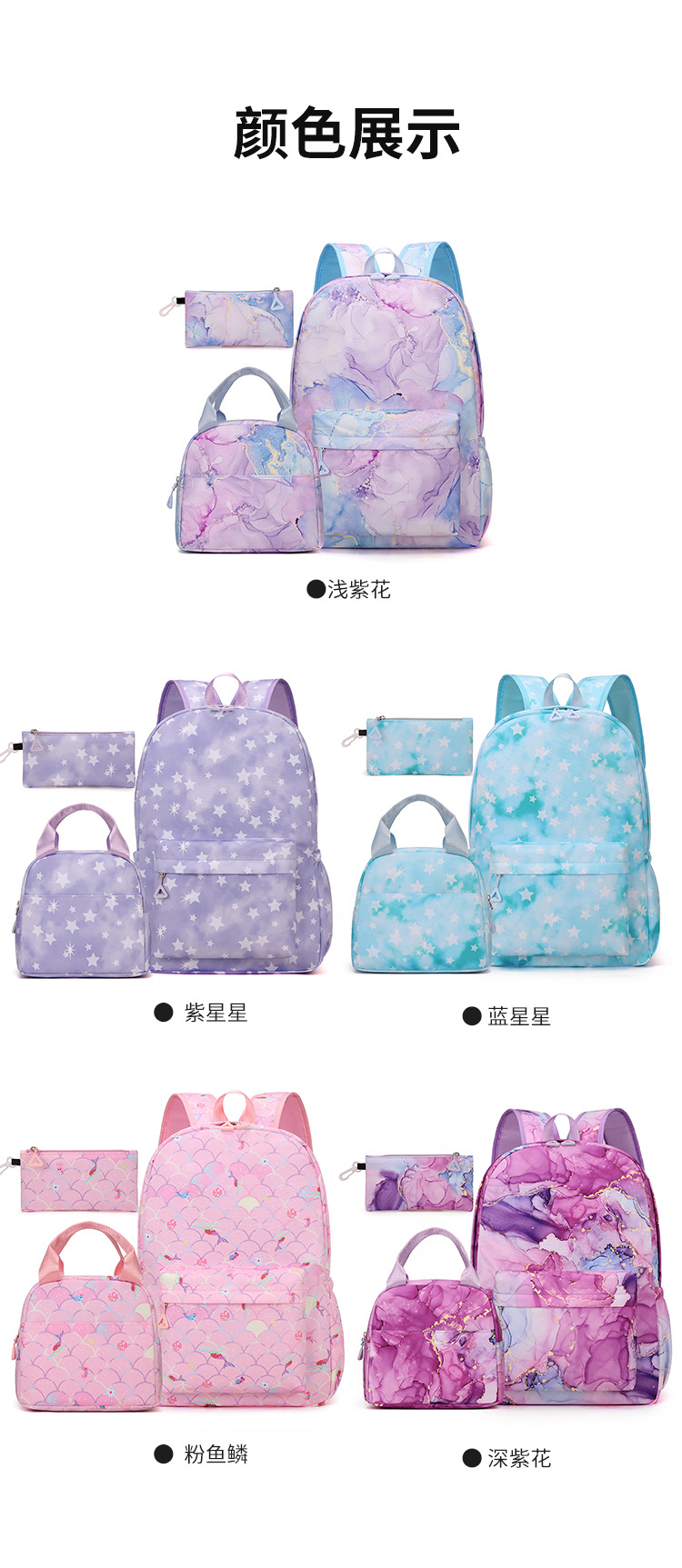 颜色 鎏金蓝,鎏金紫色,美人鱼粉,星星蓝,星星紫色