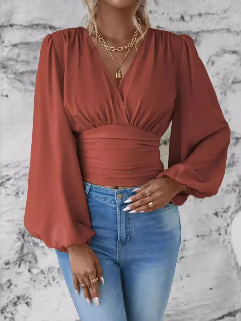 2025亚马逊跨境秋季上新纯色V领T恤时尚优雅灯笼长袖上衣秋冬女装