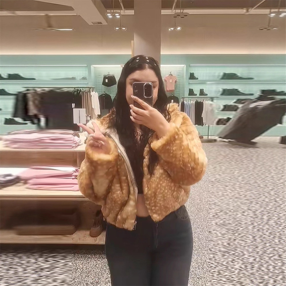 越境ECサイト向け、欧米風2025年冬新作レディースファッション、襟付きシミ模様フェイクファーショートジャケット、おしゃれ