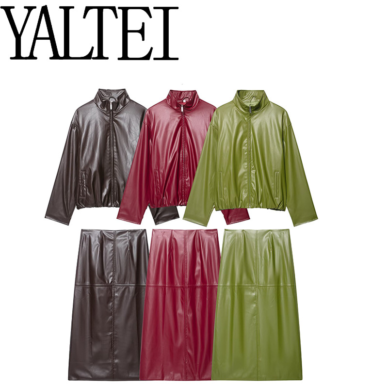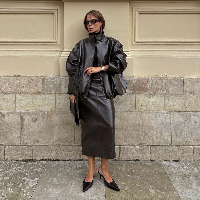 越境ECサイト「AliExpress」2025秋冬新作 無地 上品なスタンドカラー 光沢レザースカートスーツ