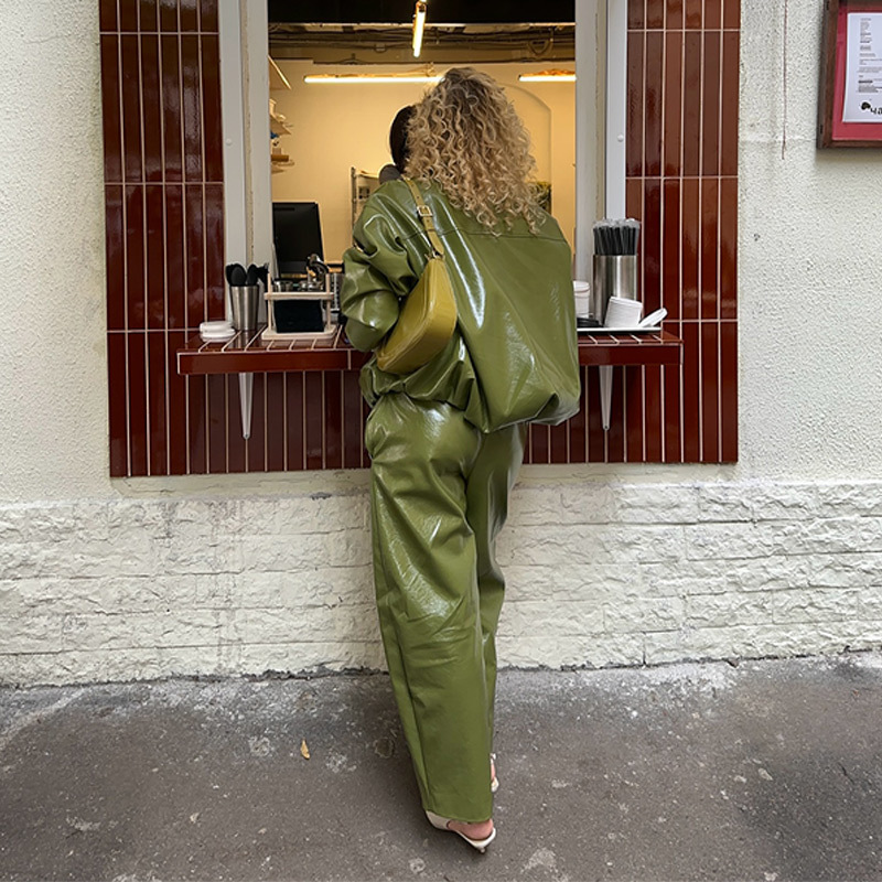 2025秋季新款欧美亚马逊跨境外贸女装拉链长袖绿色气质通勤皮套装