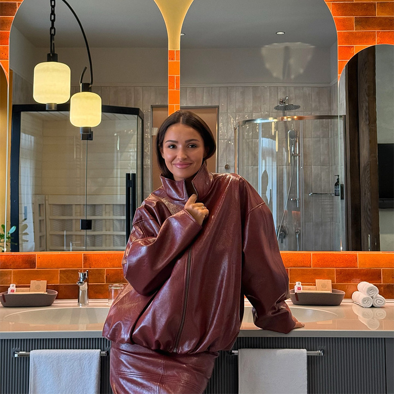 欧美2025秋冬新款女装时尚气质亮面立领皮衣外套半身裙套装女
