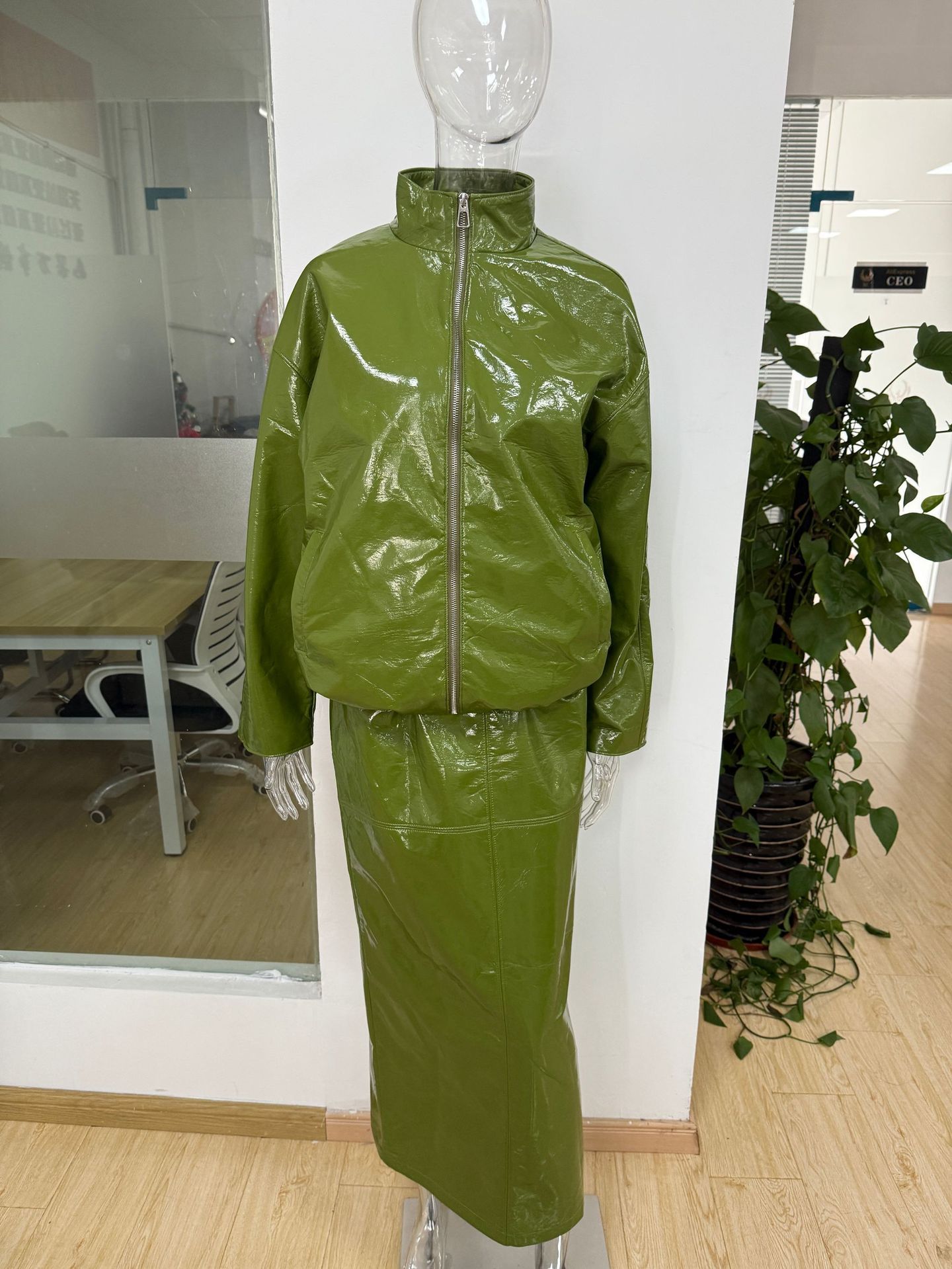 2025年秋新作 エレガントカジュアル 光沢のあるスタンドカラー レザージャケット&スカートセット