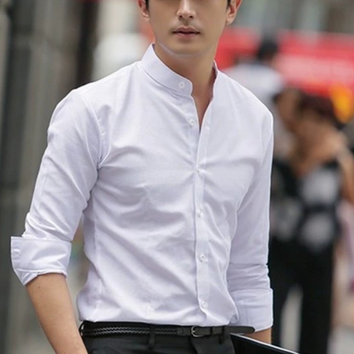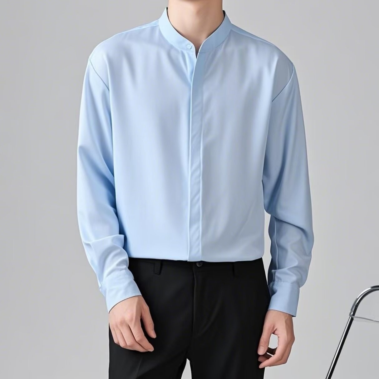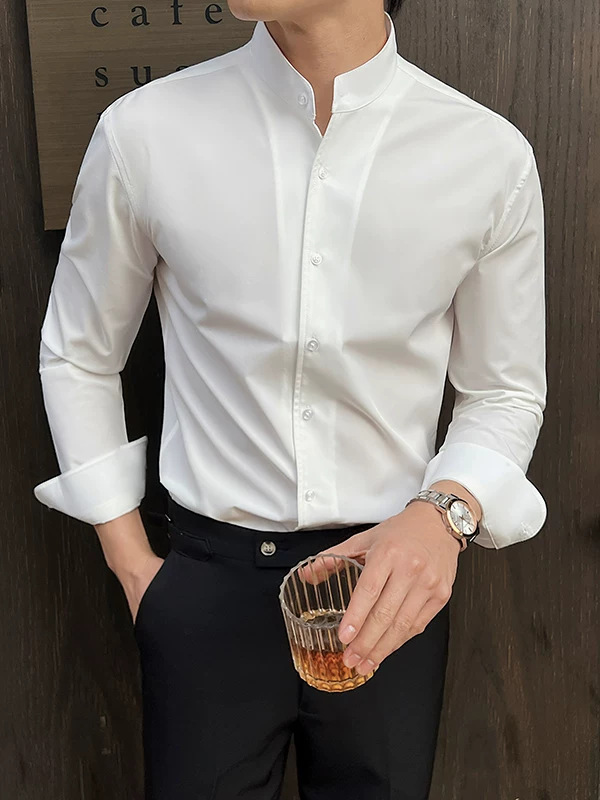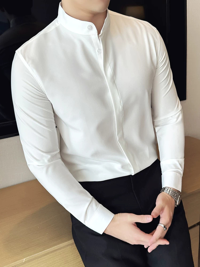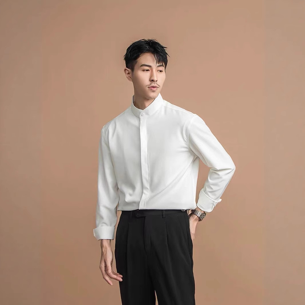 高级感白衬衫男立领暗扣修身长袖西服打底衬衣商务通勤中山领寸衫