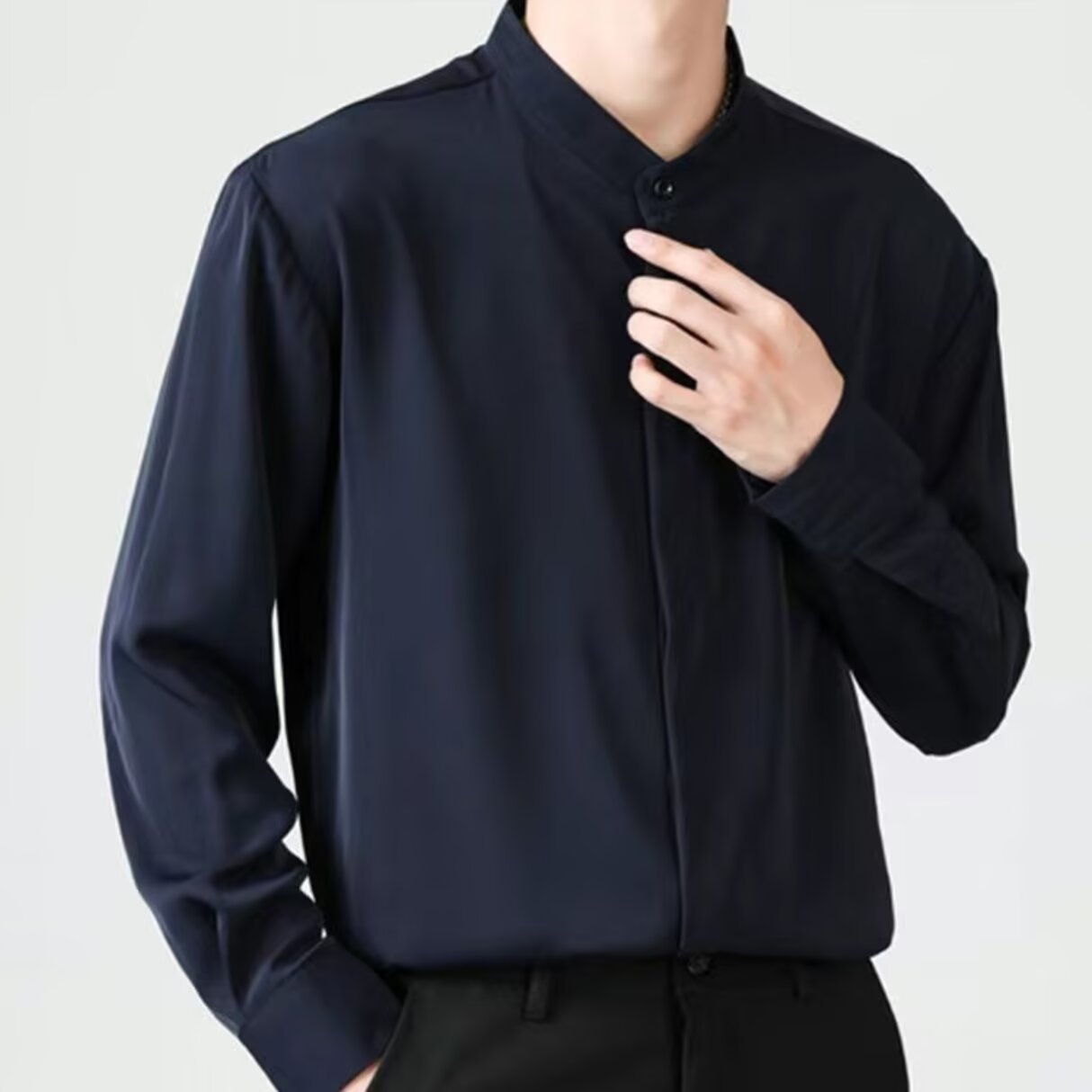 シルキー非アイロンスタンドカラー長袖シャツメンズ春秋スリムソリッドカラーシャツメンズカジュアルビジネスフォーマルインチシャツ