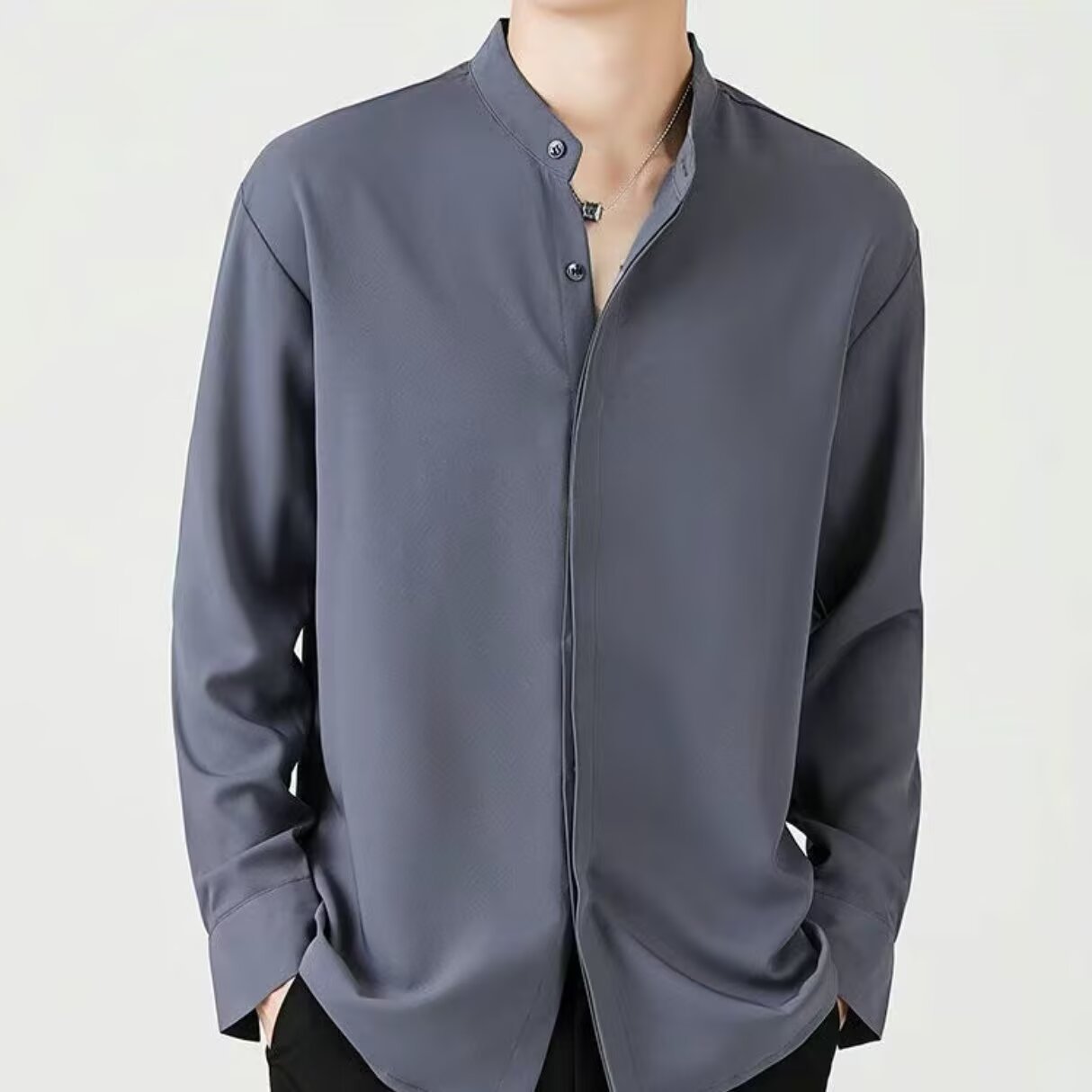 フレンチスタンドカラーダークボタンダウンシャツメンズノンアイロンシームレススリム長袖クールアイスシルクシフォンシャツカジュアルワークウェアトレンド