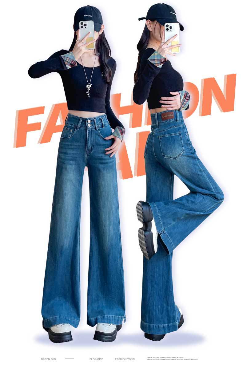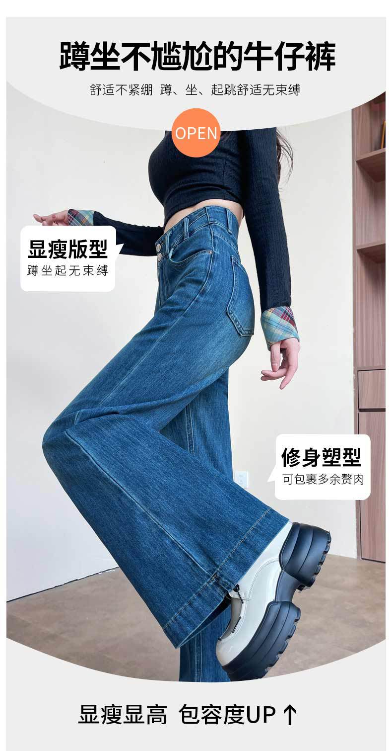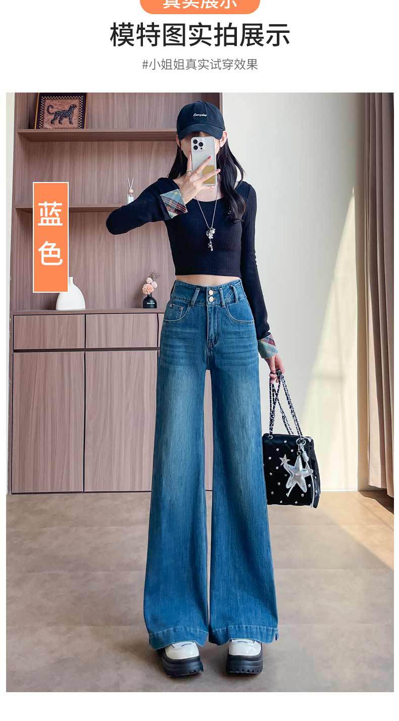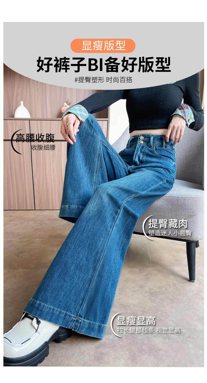 双扣高腰微喇牛仔裤女2026秋季弹力宽版遮肉遮腿型阔腿大喇叭裤子
