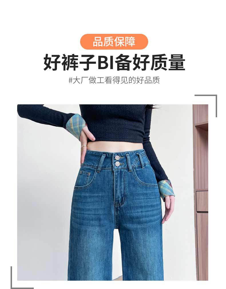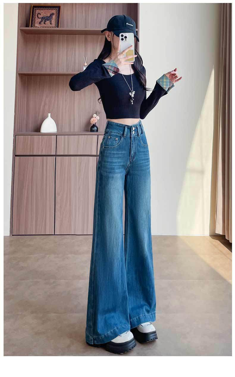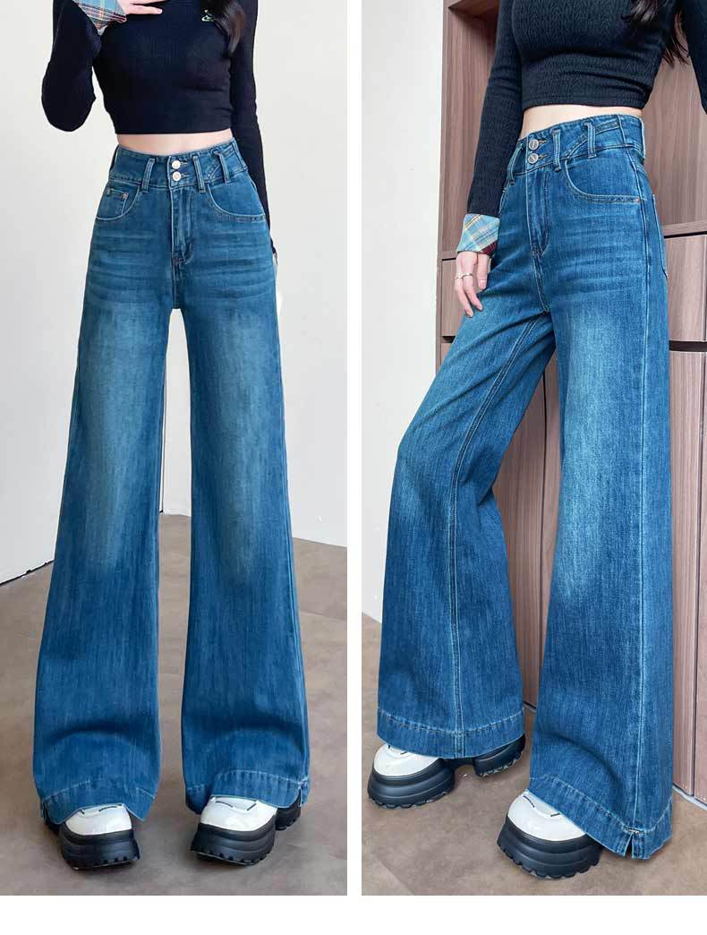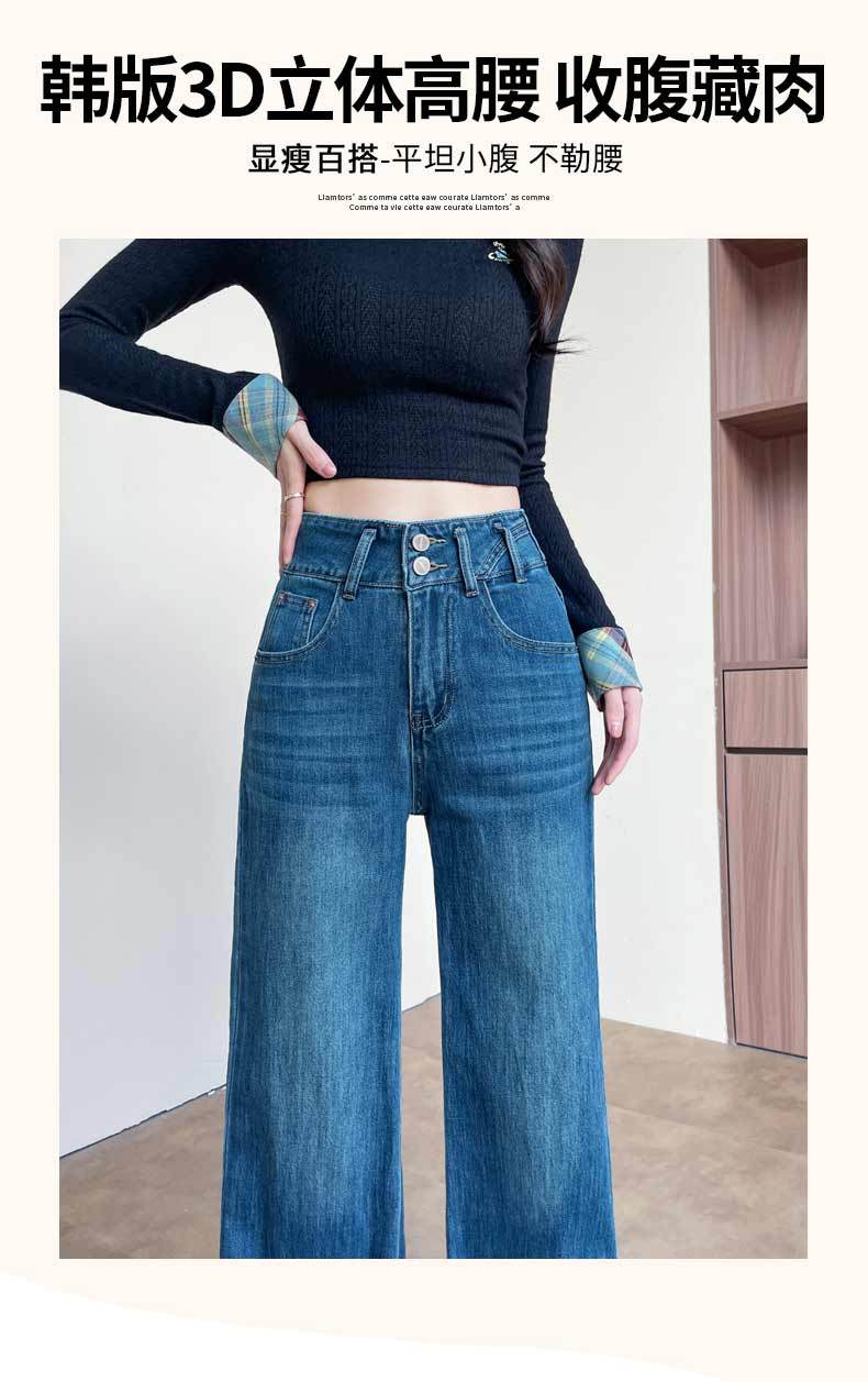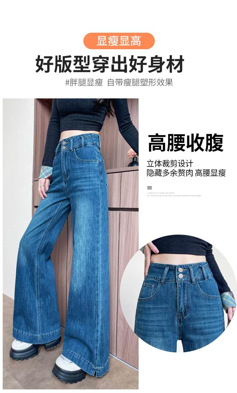 双扣高腰微喇牛仔裤女2026秋季弹力宽版遮肉遮腿型阔腿大喇叭裤子