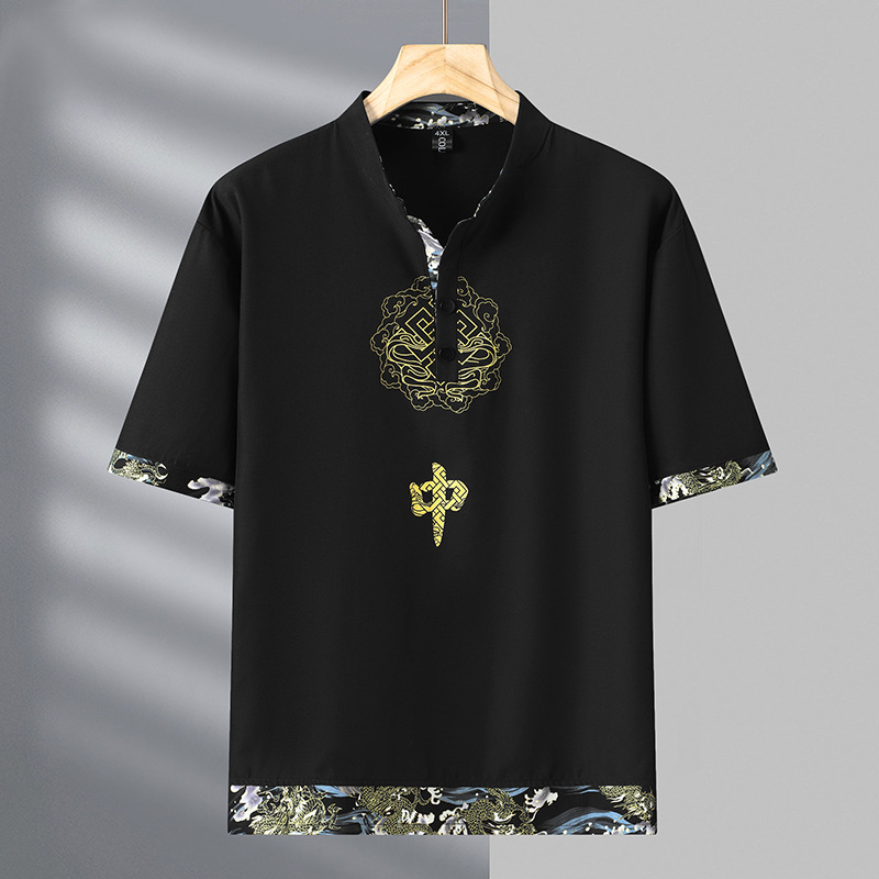 加大码翻领短袖男夏季中国风套装胖子圆领宽松休闲长裤冰丝三件套