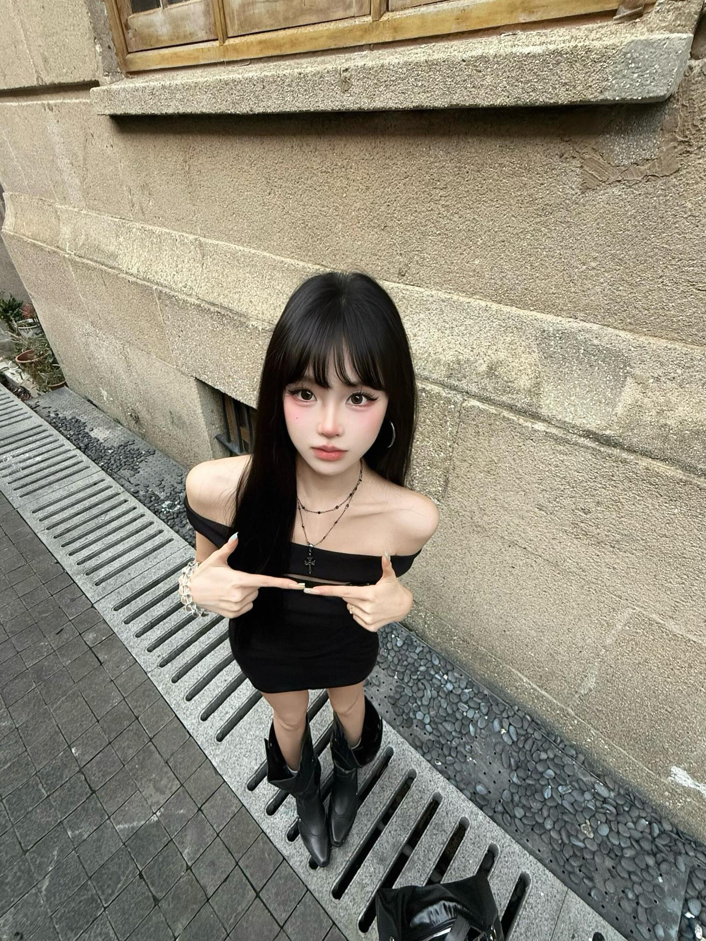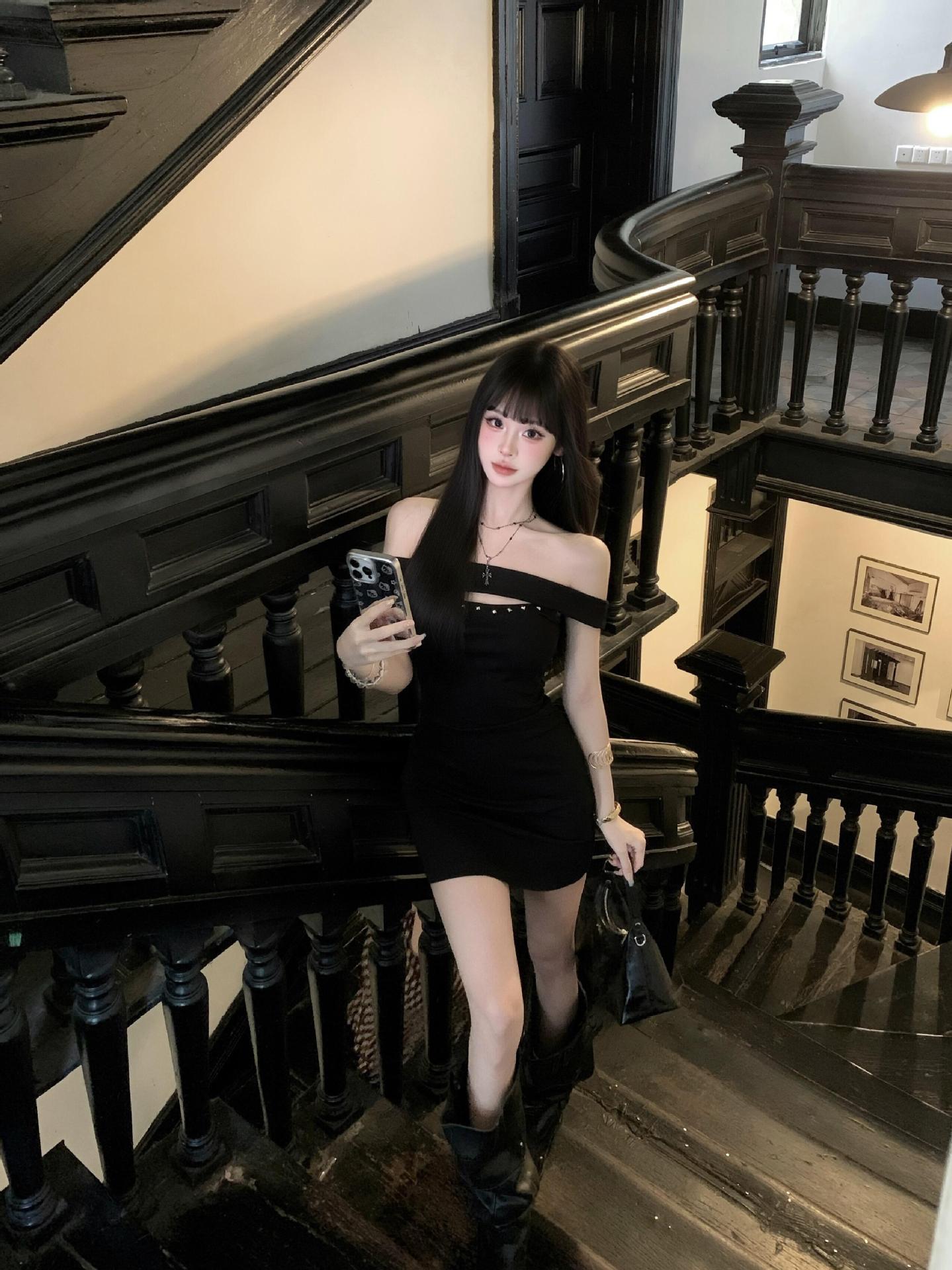 外贸铆钉镂空连衣裙女2025秋冬新款收腰修身一字肩纯欲女装小黑裙