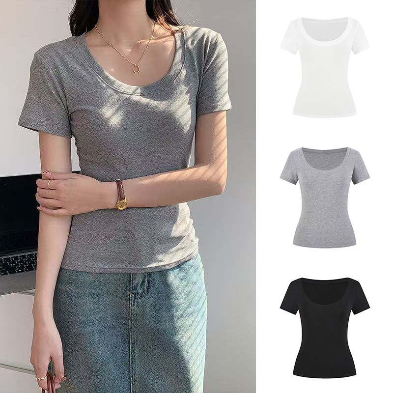 ビッグUネックスリム半袖レディース2025夏新作韓国Tシャツ白右肩ボトムシャツ外国貿易レディーストップス
