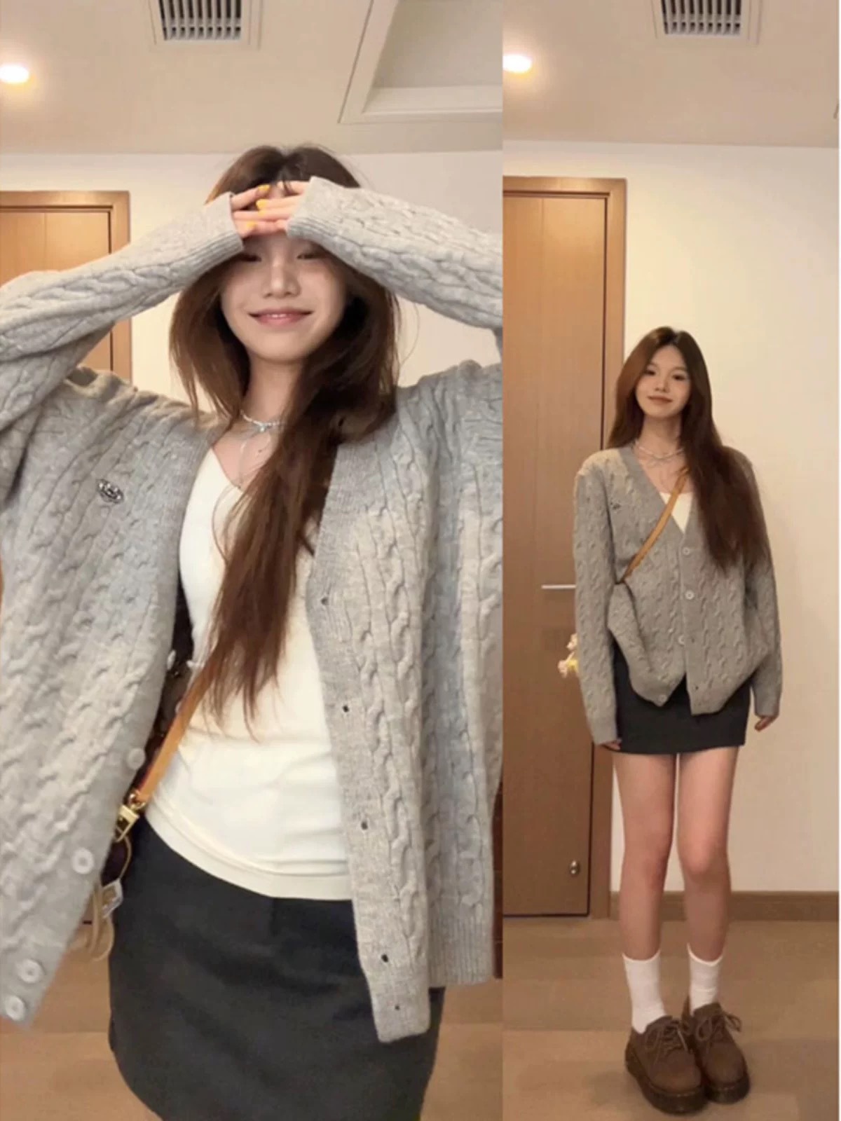 灰色慵懒风V领麻花针织开衫女2025早秋季新款宽松中长款毛衣外套