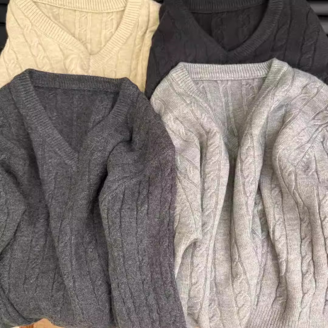 Vネックの怠惰な高級感の柔らかいモチモチの麻花のセーターの女性の2025新型の春秋の中で長袖のニットの上着を掛けます。