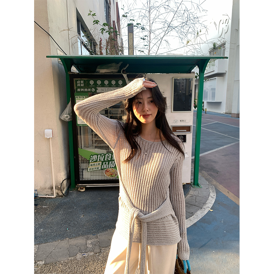 广州黄峥韩版早秋潮流新款假两件休闲针织长袖挂脖露肩毛衣530050