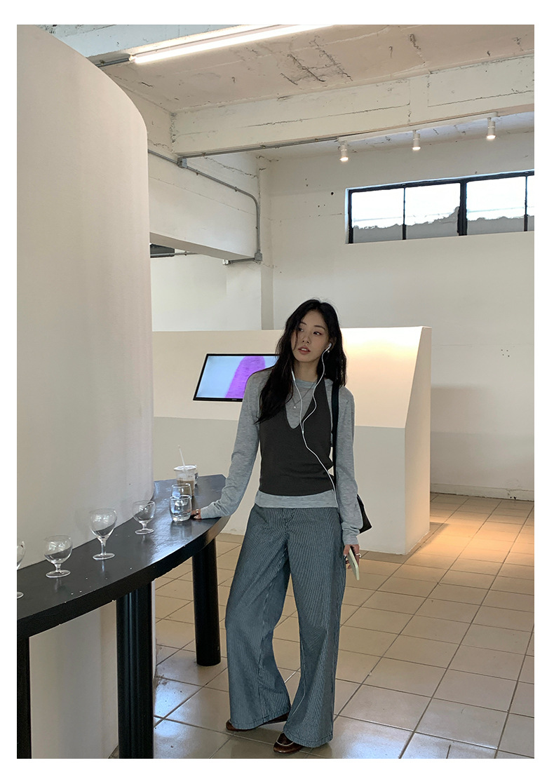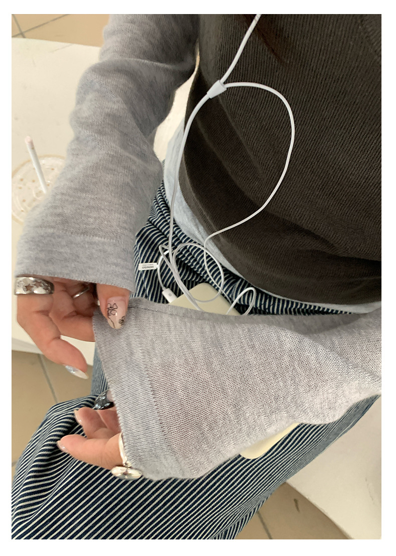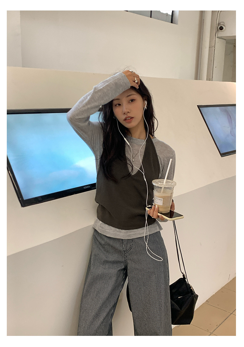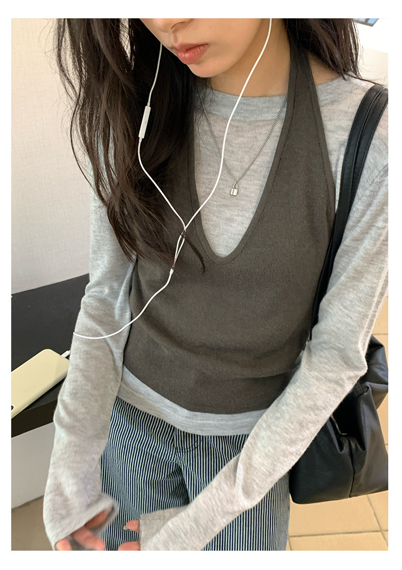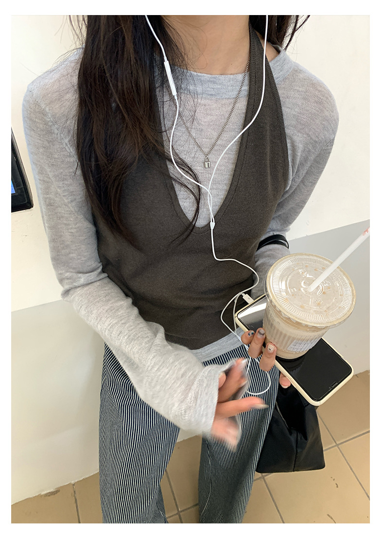 广州黄峥韩版早秋两穿外搭冰丝长袖开衫+针织背心上衣套装530051