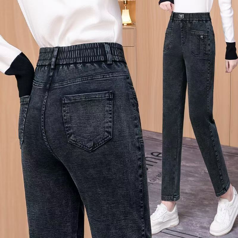 ハイウエストジーンズレディースパンツ2025秋冬新作プラスサイズファットmmスリム弾性ウエスト小脚パンツプラスベルベット