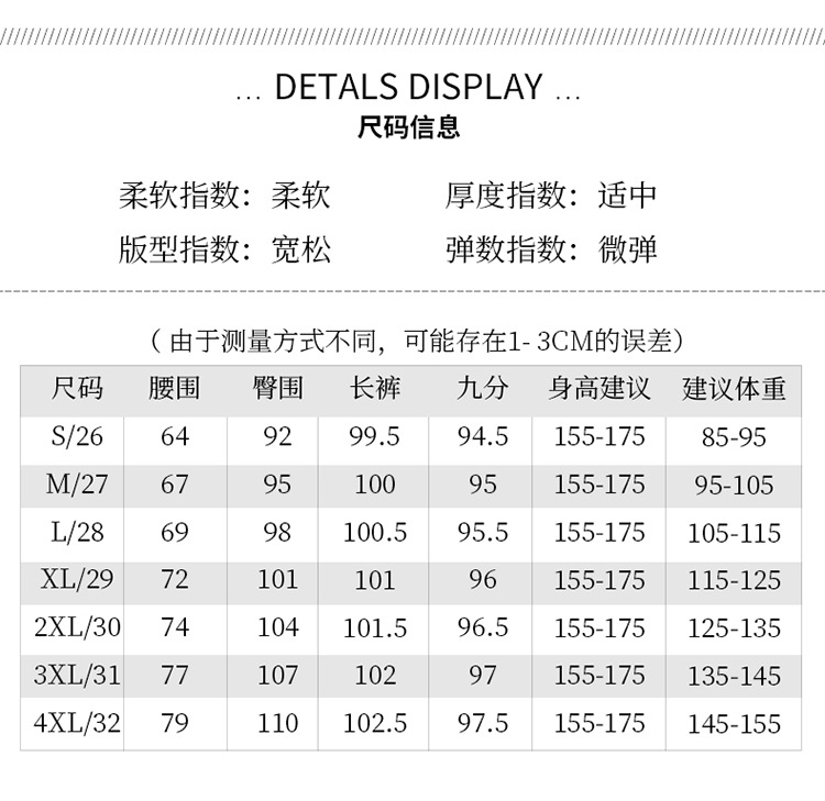 尺码 26建议80-95斤,27建议95-105斤,28建议105-115斤,29建议115-125斤,30建议125-135斤,31建议135-145斤,32建议145-160斤