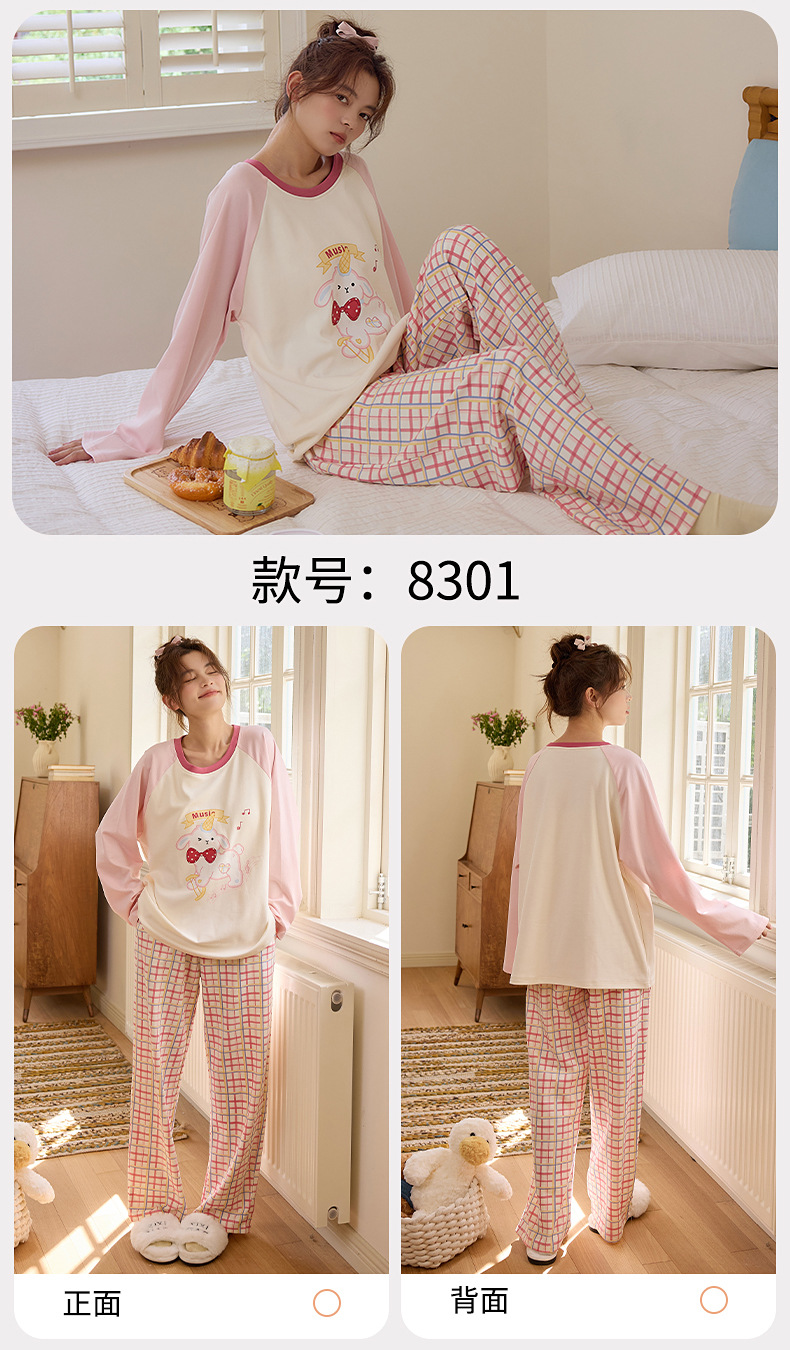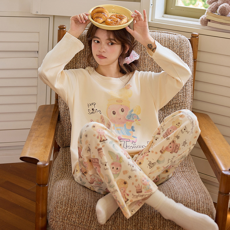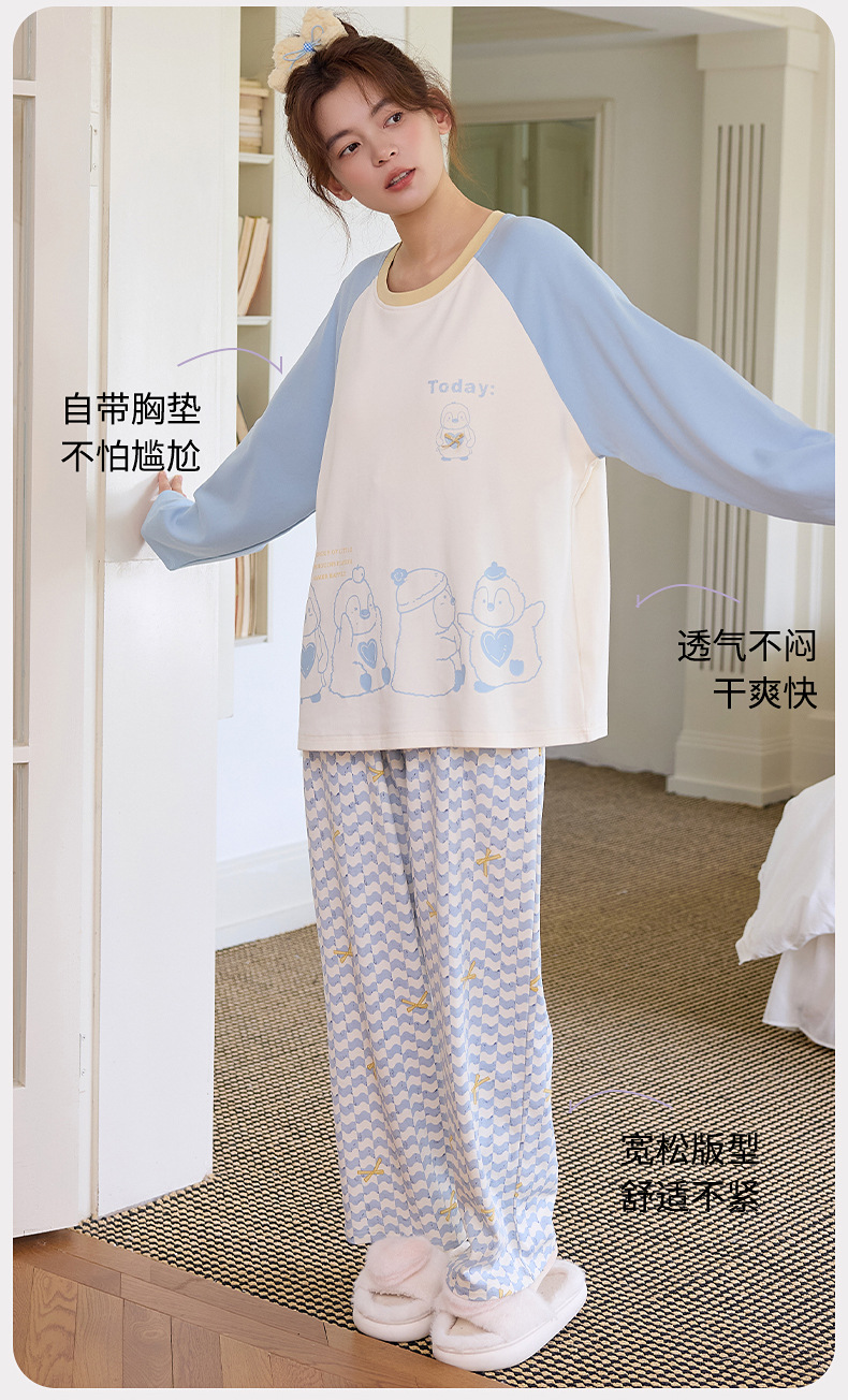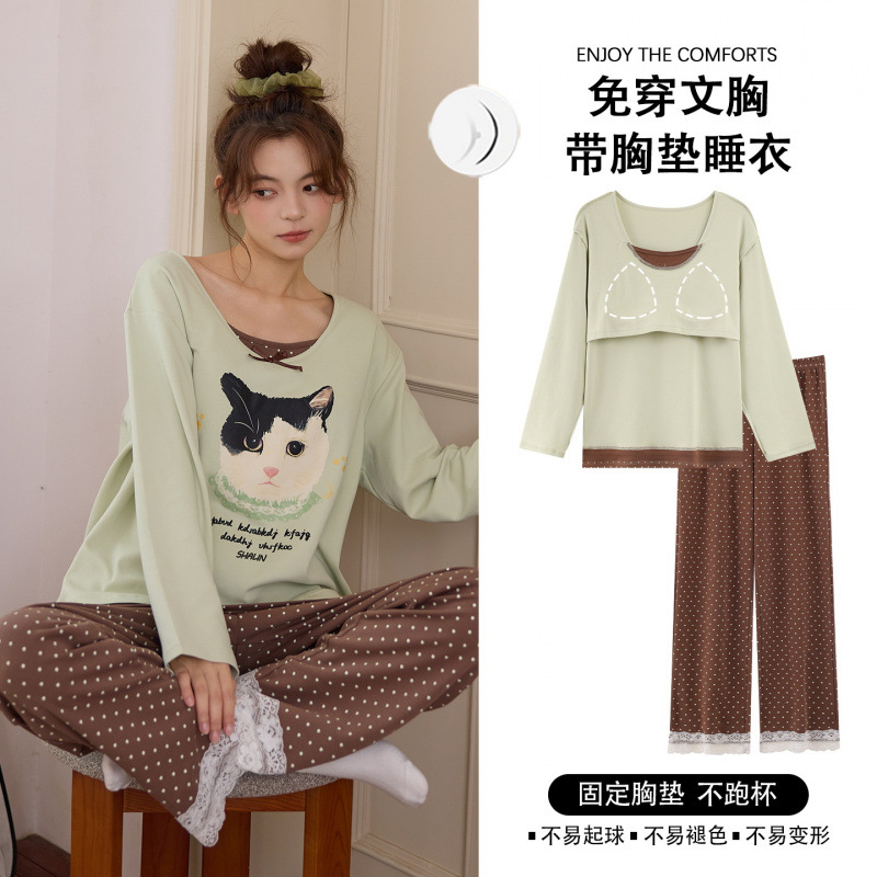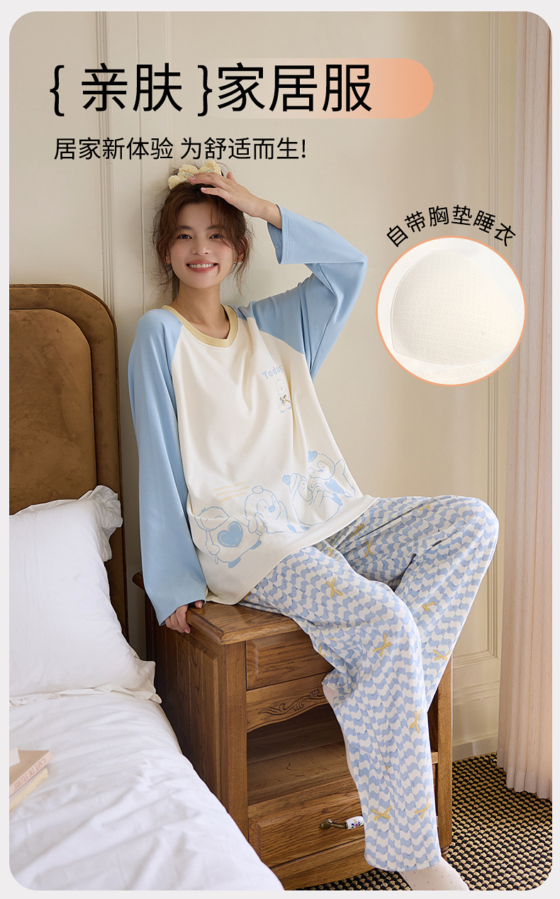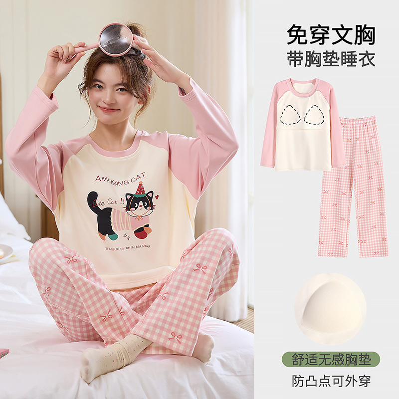 60棉带胸垫睡衣女春秋季长袖卡通可爱网红可外穿秋冬款家居服套装