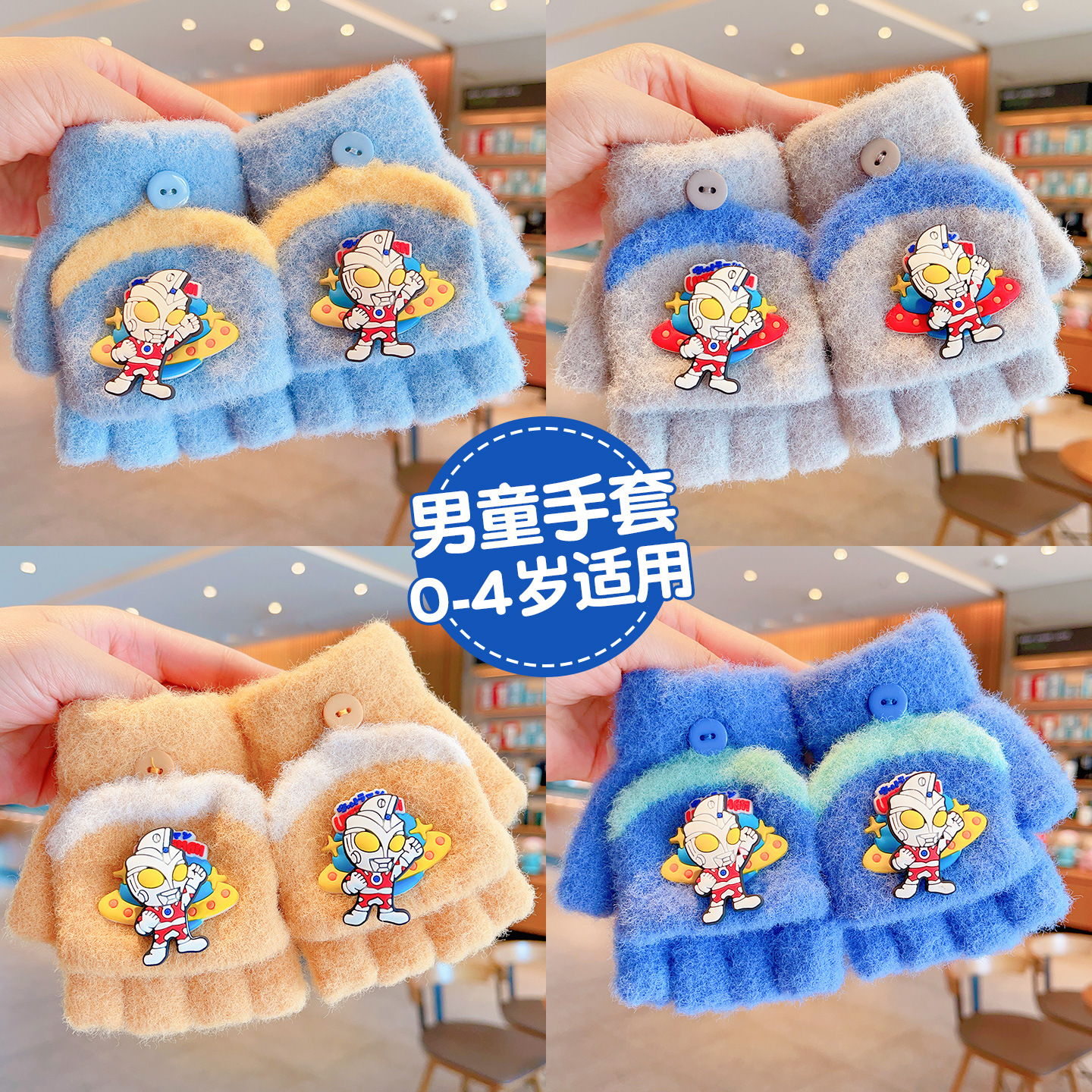 儿童奥特曼手套冬季男孩发光翻盖露指套宝宝防寒保暖写字半指分指