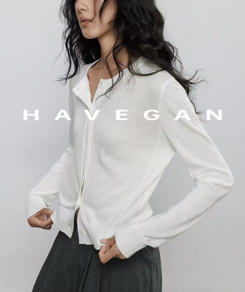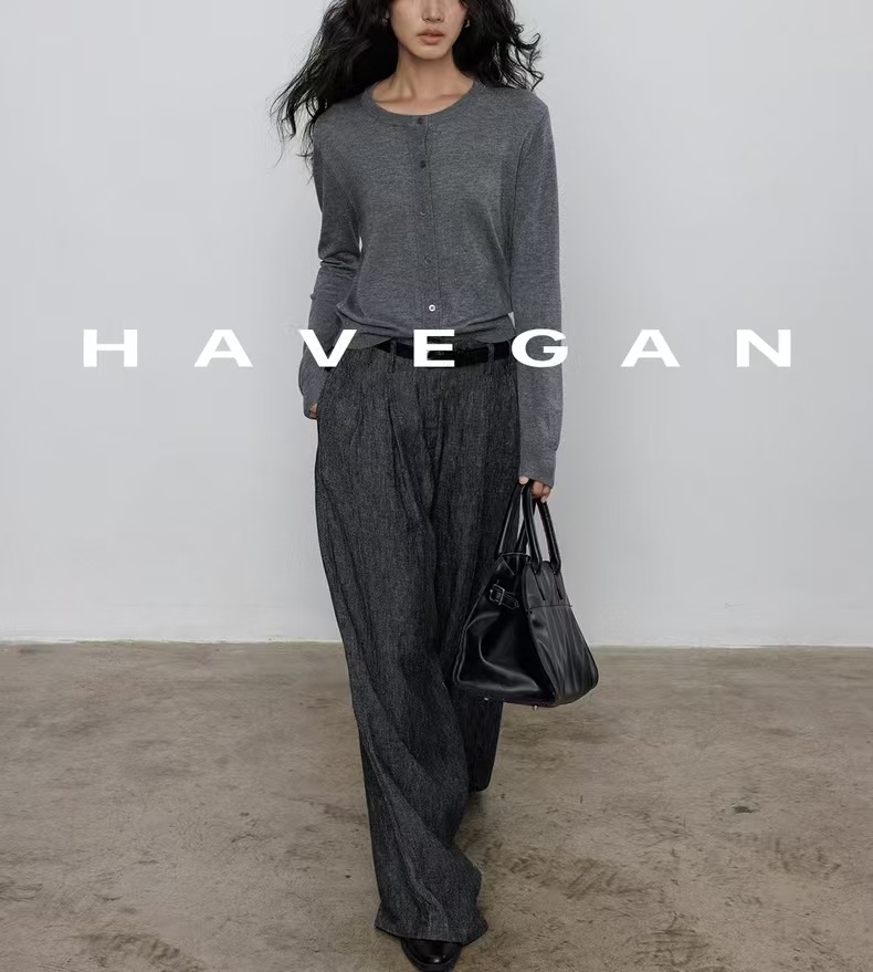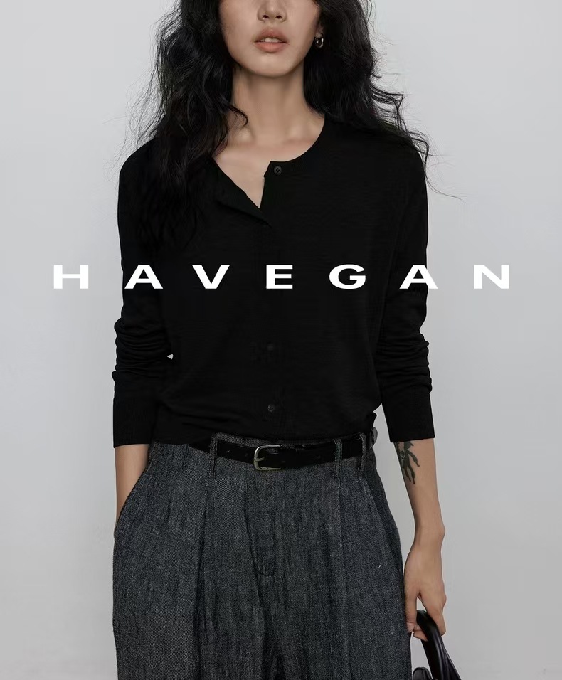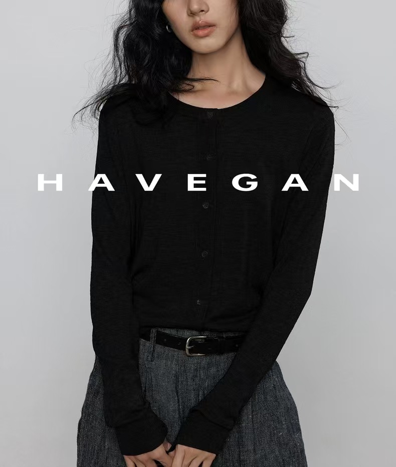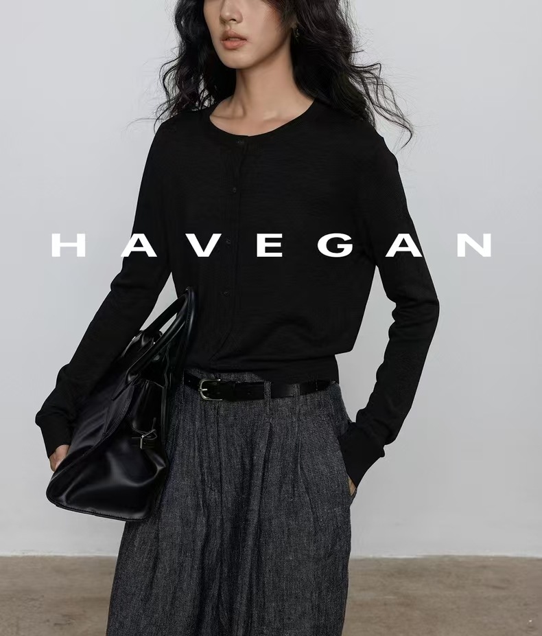 与间HAVEGAN/秋季圆领长袖针织开衫女薄款外穿宽松慵懒老钱风上衣