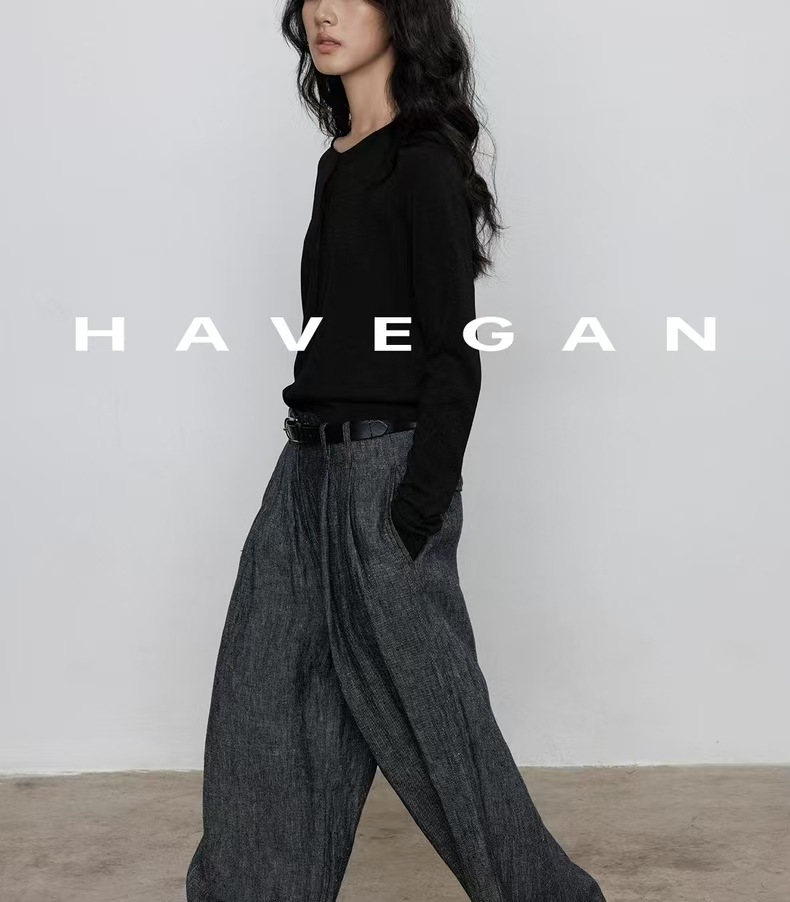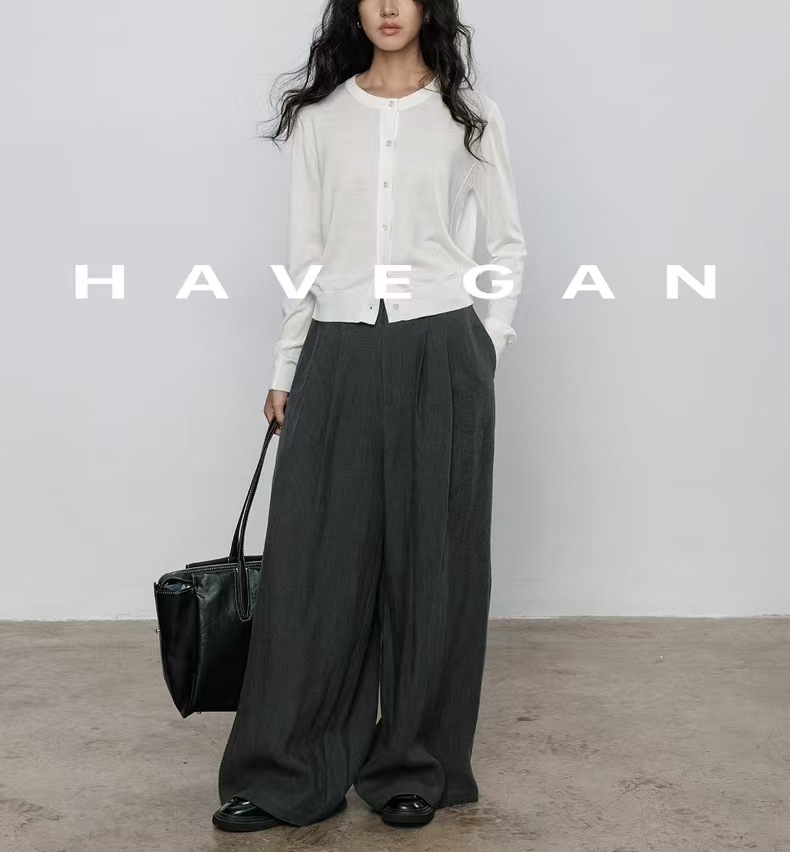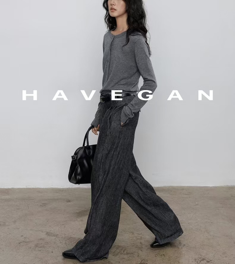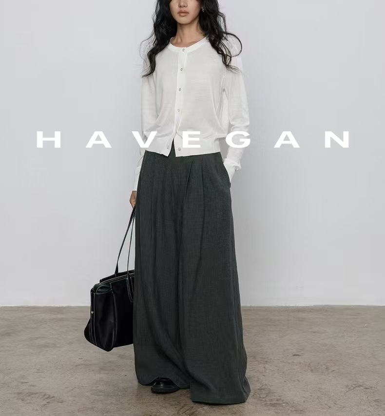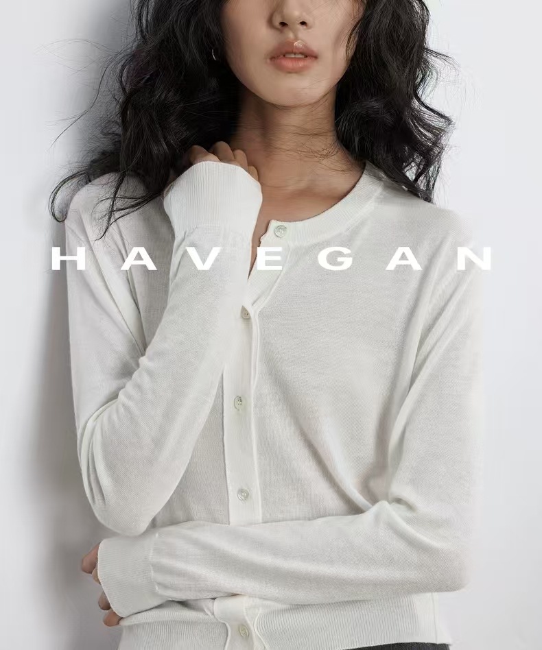 与间HAVEGAN/秋季圆领长袖针织开衫女薄款外穿宽松慵懒老钱风上衣