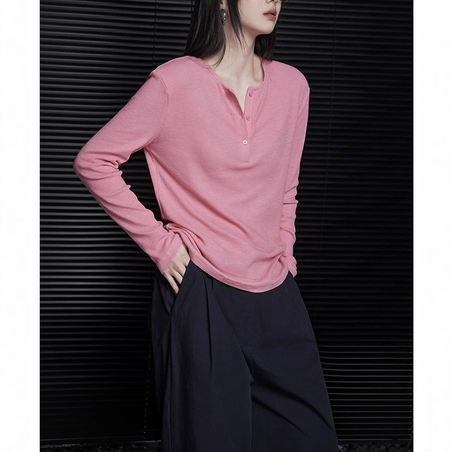 Momentピンク修身長袖気質ニットtシャツ女性デザイン感小衆2025早秋ボトムシャツ